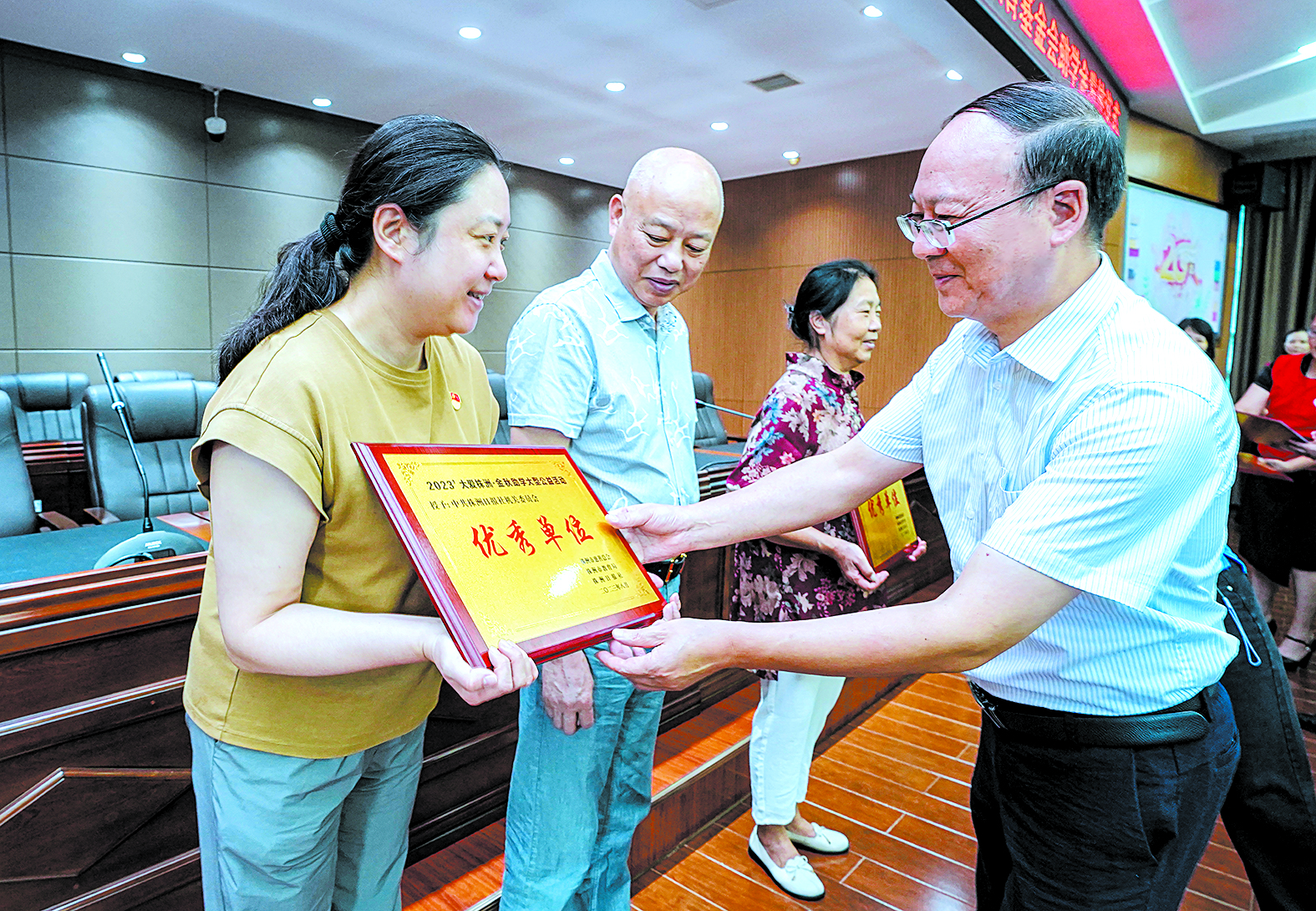 为捐资助学优秀单位颁发荣誉牌匾。记者/刘震 摄