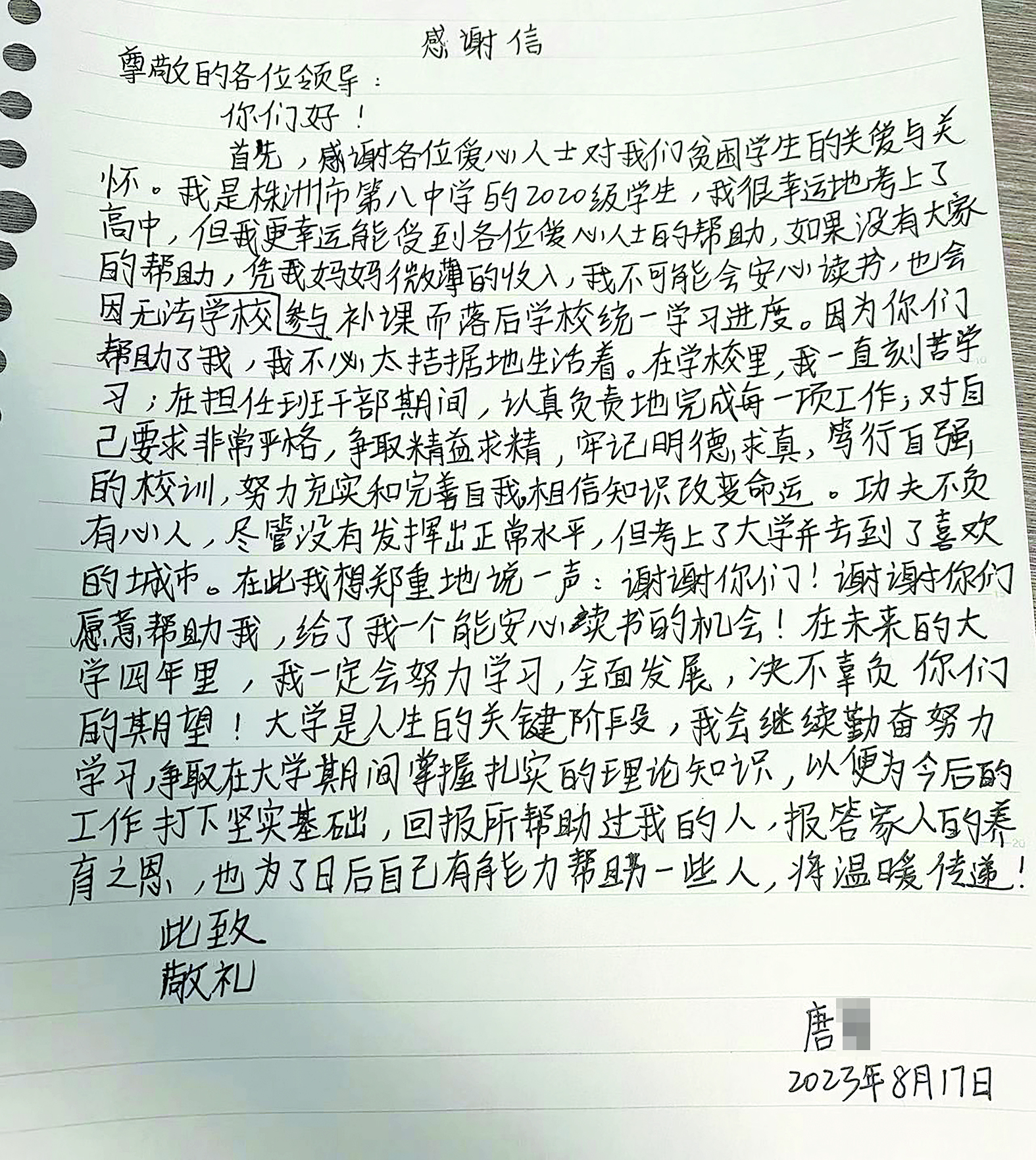 本报讯(株洲晚报融媒体记者/郑炜青) 见面会前夕,株洲日报社知株侠助学季工作组收到一封来信,写信的是天元区三门镇的唐同学。唐同学幼年丧父,母亲打零工,收入十分微薄,是天元区幸福教育基金会资助的大一新生。日前,唐同学在微信里收到参加助学金发放仪式的邀约时,人已经到了西安文理学院。为此,他特意写了一封感谢信,然后拍照发给了联系他的志愿者。