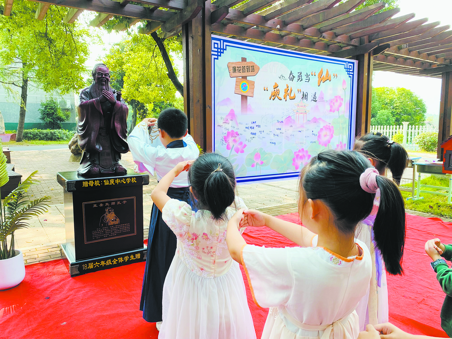 仙庾中心学校的新生礼拜孔子像。通讯员供图