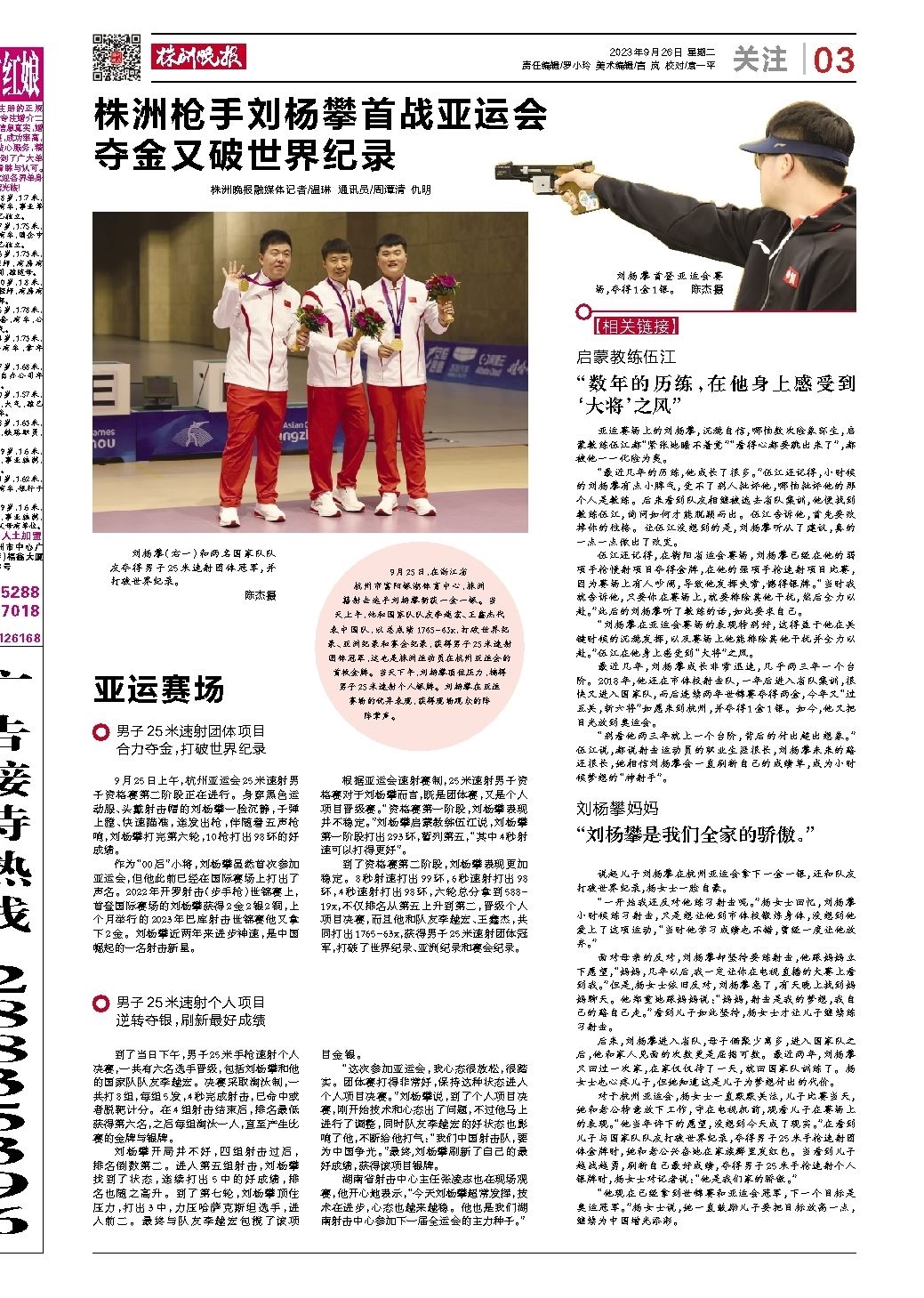 株洲枪手刘杨攀首战亚运会 夺金又破世界纪录