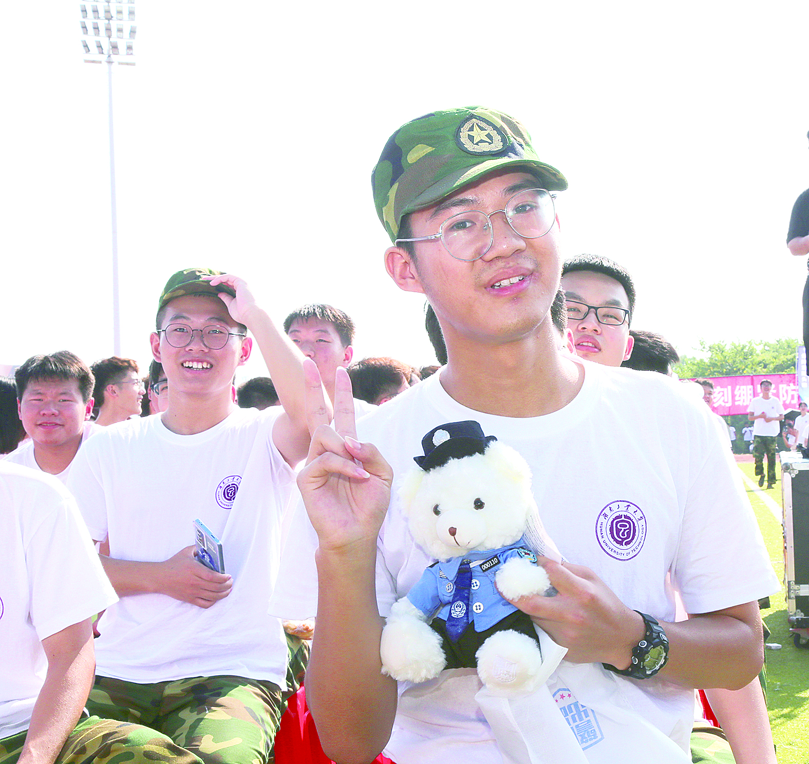 通过反诈知识有奖问答互动,大学生开心地领到作为奖品的“警察小熊”。 记者/沈全华 通讯员/阎俊 摄