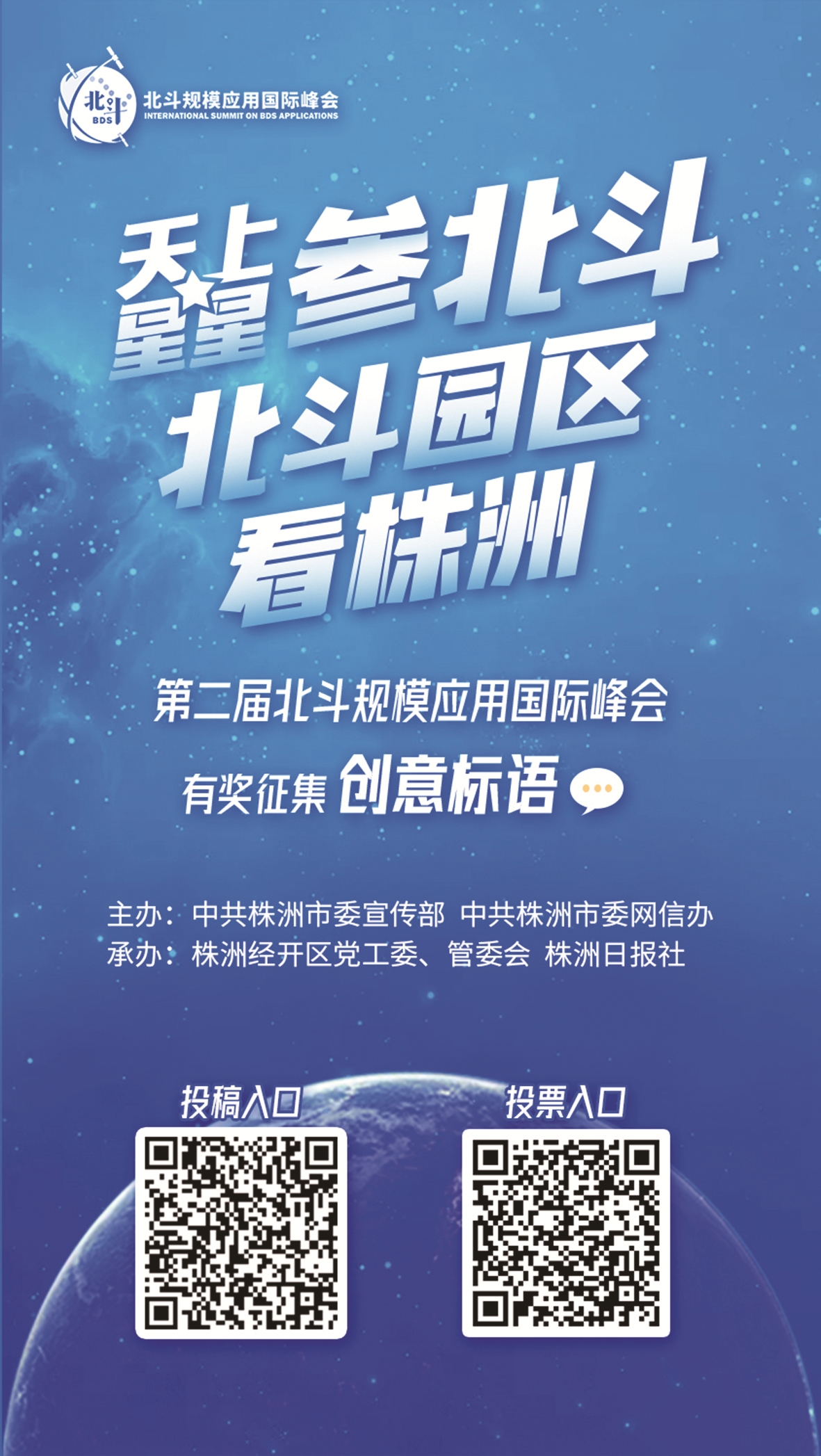 此次标语征集活动由中共株洲市委宣传部、中共株洲市委网信办主办,株洲经开区党工委、管委会,株洲日报社承办。征集活动将持续至9月12日,网络投票同步启动,结合专家评审,将择优评选金句奖1名,奖励5000元;创意奖10名,各奖励1000元;国际传播奖2名,各奖励1000元;网络人气奖10名,各奖励500元。入选创意标语将用于“北斗峰会”现场展示及媒体宣传。今天是“北斗峰会”创意标语征集活动的最后一天,欢迎大家积极投稿,为中国制造的北斗卫星打卡代言,为株洲蓬勃发展的北斗产业喝彩鼓劲。