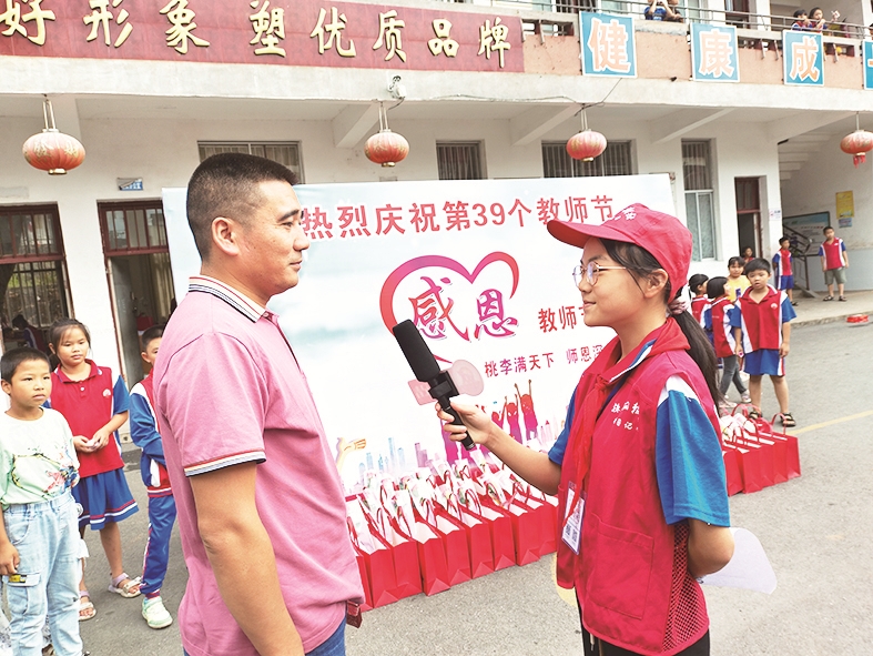 杉木塘小学庆祝第39个教师节表彰活动后,校园记者采访获奖的优秀教师。通讯员/吴欣阁 摄
