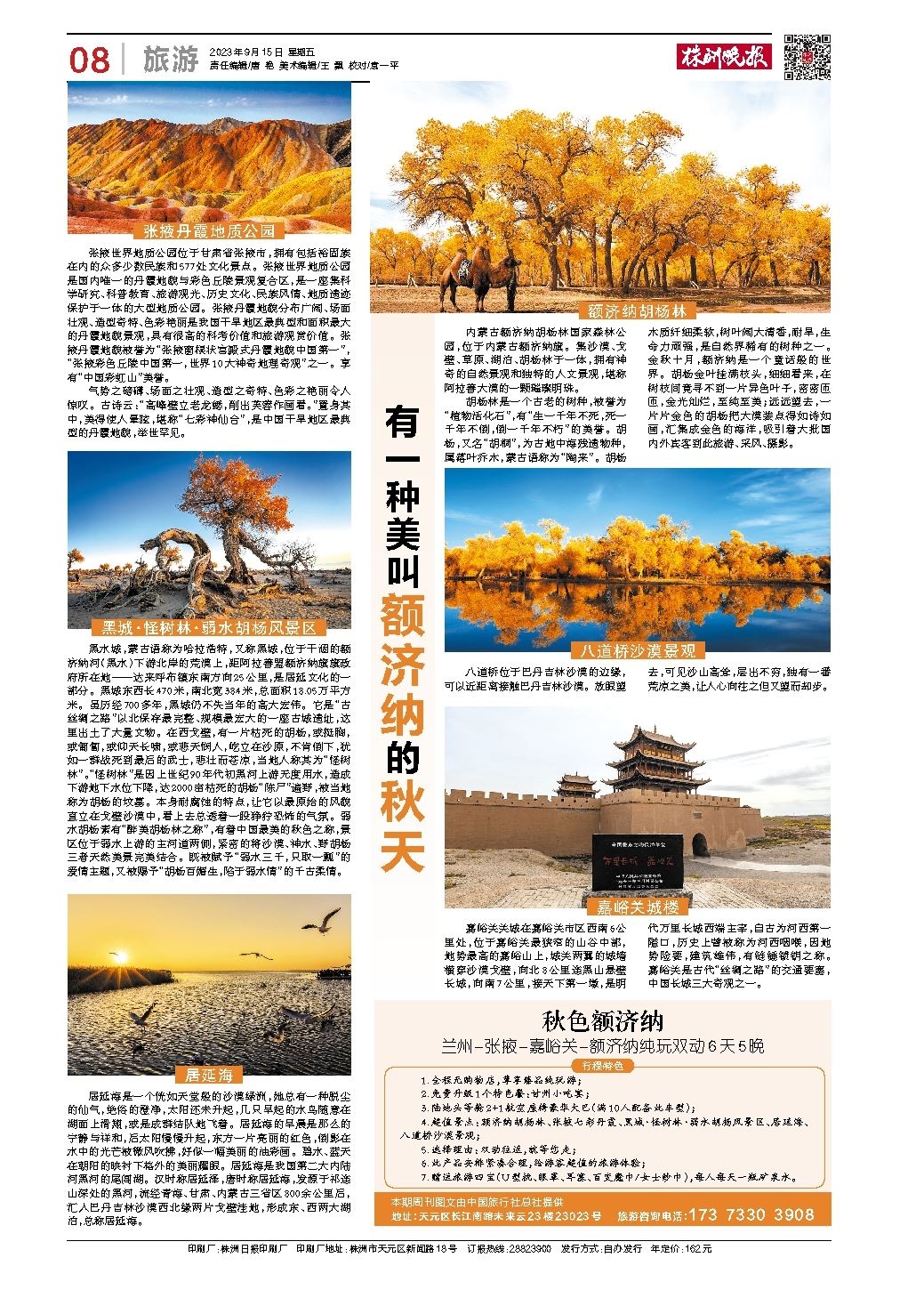 4.超值景点:额济纳胡杨林、张掖七彩丹霞、黑城·怪树林·弱水胡杨风景区、居延海、八道桥沙漠景观;