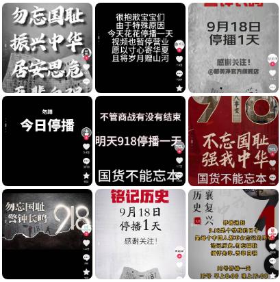 9月18日,蜂花、郁美净、鸿星尔克等众多知名国货品牌停止直播一天,提醒国人勿忘国耻,珍惜当下的幸福生活。同时,多家国货品牌还将抖音账号头像换成黑白色,以此向革命先烈致敬。