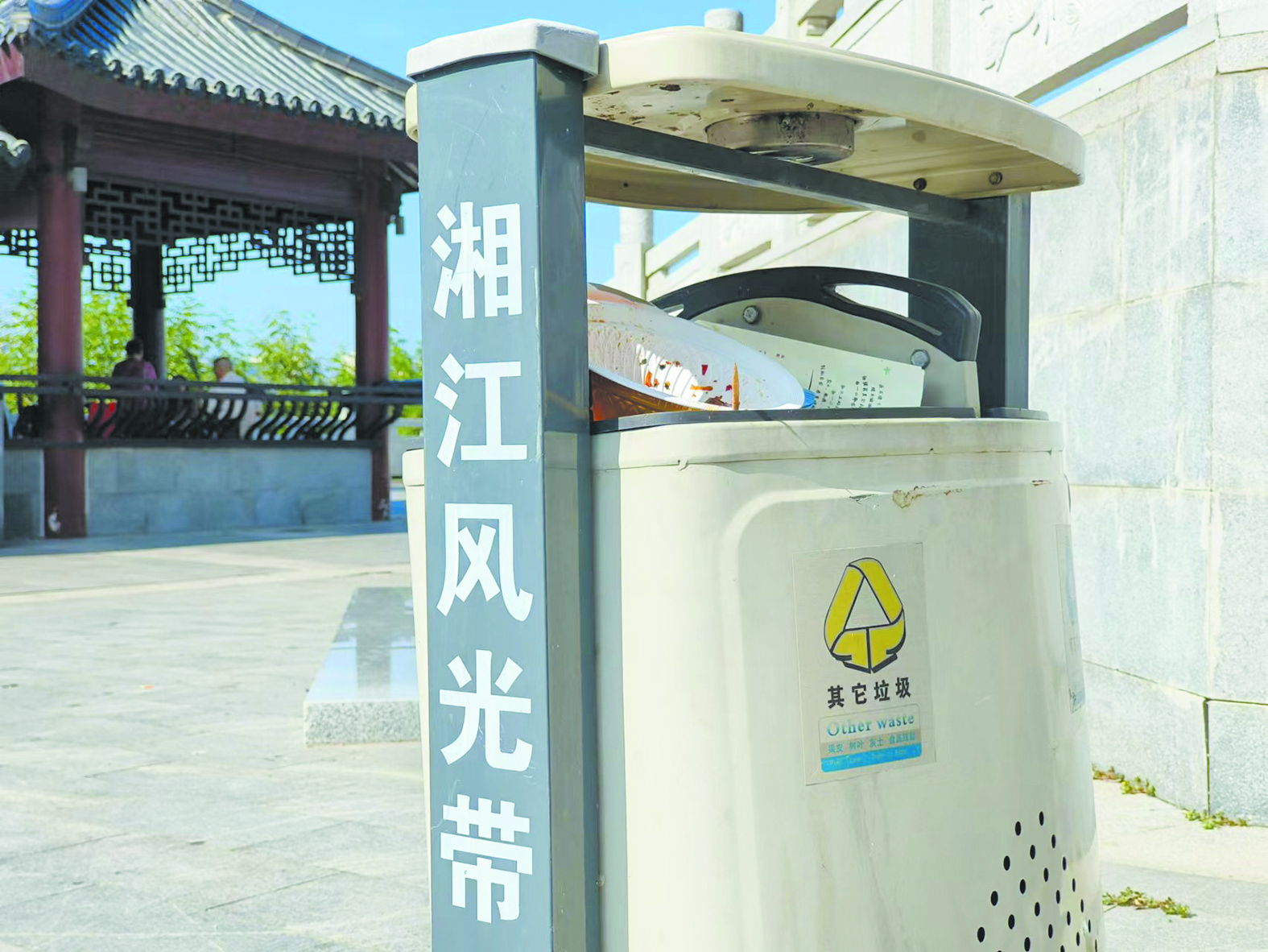 分袂亭广场上垃圾桶里垃圾满溢。记者/廖智勇 摄