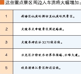 “双节”假期,市民出行总体以返乡、休闲、中长途旅游出行为主,届时,城市商圈、车站,仙庾岭、炎帝陵、神农谷、方特欢乐世界、酒埠江景区等重点旅游景区、城郊农庄等休闲场所人车流将大幅增加。城区公园、城郊农庄、沿江风光带等适合休闲娱乐的休闲场所及周边道路、路段人车流同样会增长明显。