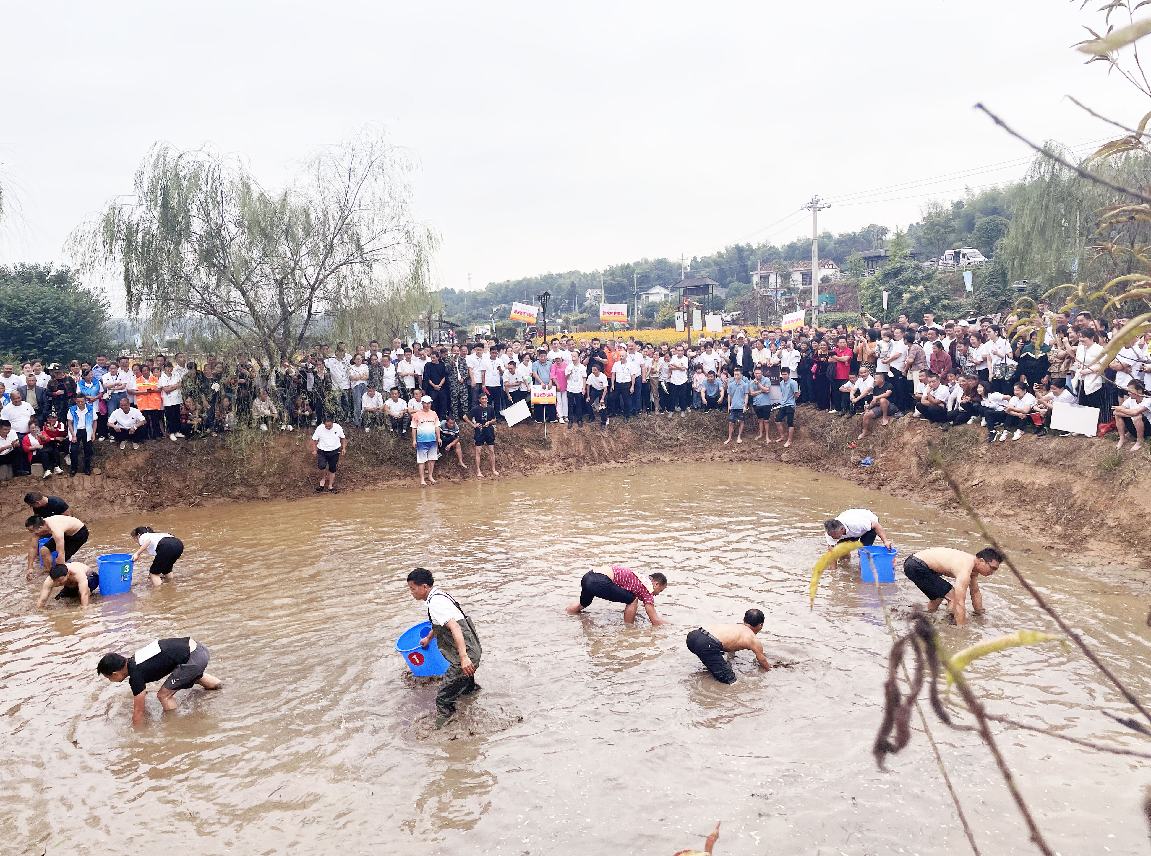 运动会设置了篮球、拔河、浑水摸鱼、夹气球、挑担运粮、赶鸭子等贴近农业、农村、农民的竞赛项目,让观众大饱眼福。图为“浑水摸鱼”比赛现场。