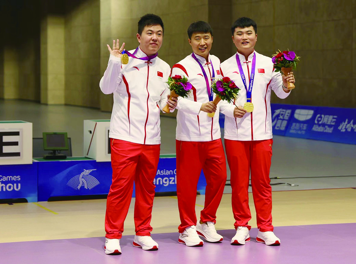 刘杨攀(右一)和两名国家队队友夺得男子25米速射团体冠军,并打破世界纪录。 陈杰摄