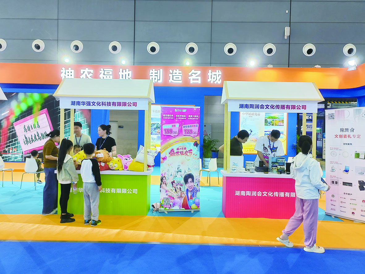 文创产品部分以“株洲造 礼世界”为主题,三圆惟度、华强文化、陶润会等株洲文旅企业带来不少具有株洲特色的文创商品。例如,“炎帝爷爷”系列盲盒、祈福系列香包、铁盒红茶、黄桃糕点等等,展示了株洲独特的历史记忆、文化基因与风土人情,动画IP熊大、熊二、小月亮形象的暖手套、抱枕等深受孩子们的喜爱。