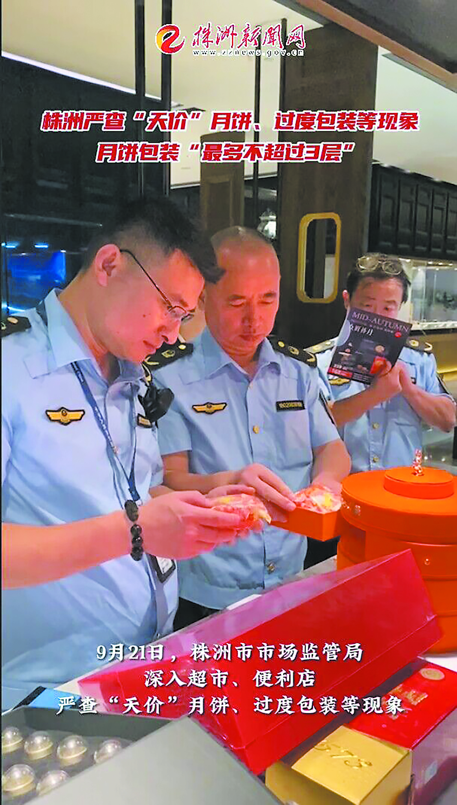 9月21日,株洲市市场监管局深入超市、便利店,严查“天价”月饼、过度包装等现象。执法人员仔细核对销售记录,对商品原价、现价逐一对比,严禁商家趁节日大幅提高商品价格。当天检查,未发现“天价”月饼、过度包装等现象。