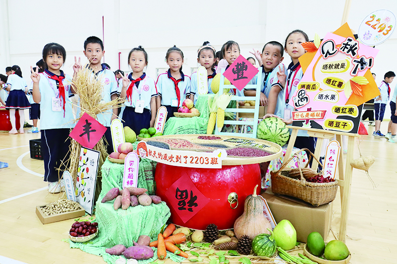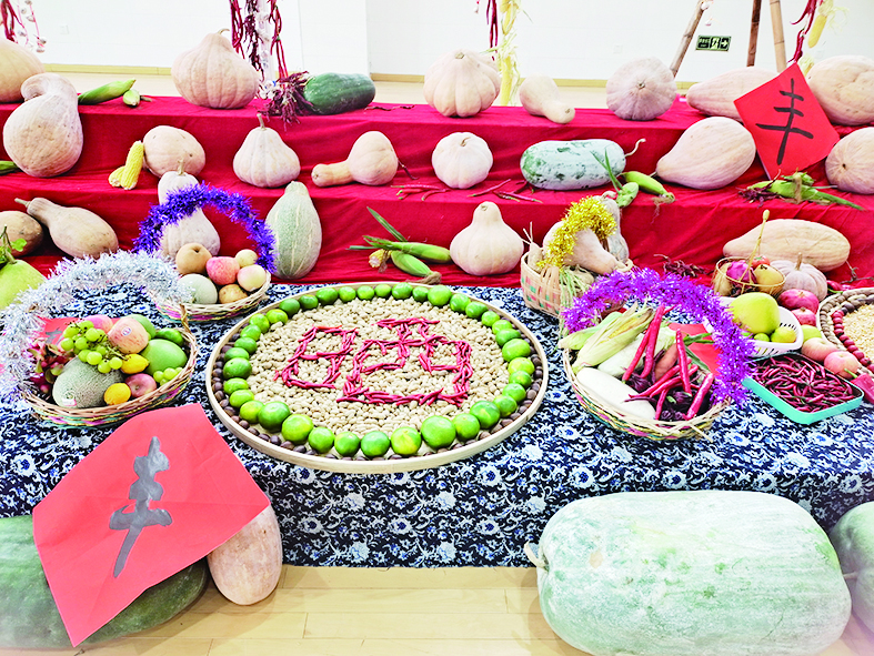 “晒秋实”活动中,学生们用各式各样的粮食、水果、蔬菜等,摆出“五谷丰登”“芙蓉晒秋”“来芙蓉晒个秋”等各式各样的图案,庆祝第六个农民丰收节的到来。