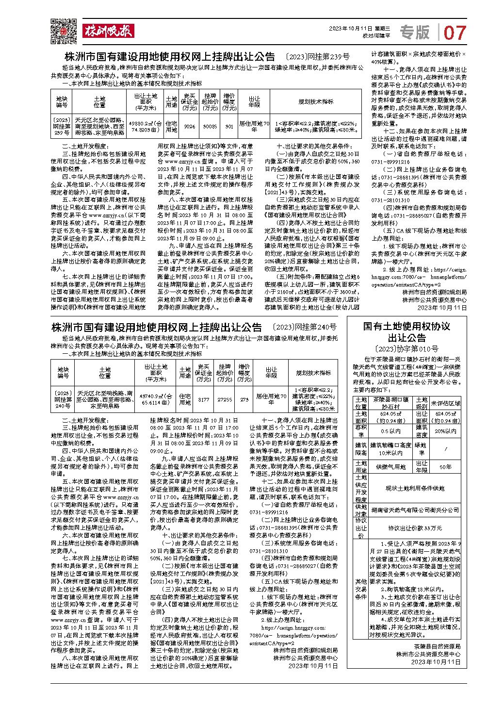 株洲市国有建设用地使用权网上挂牌出让公告 〔2023〕网挂第240号