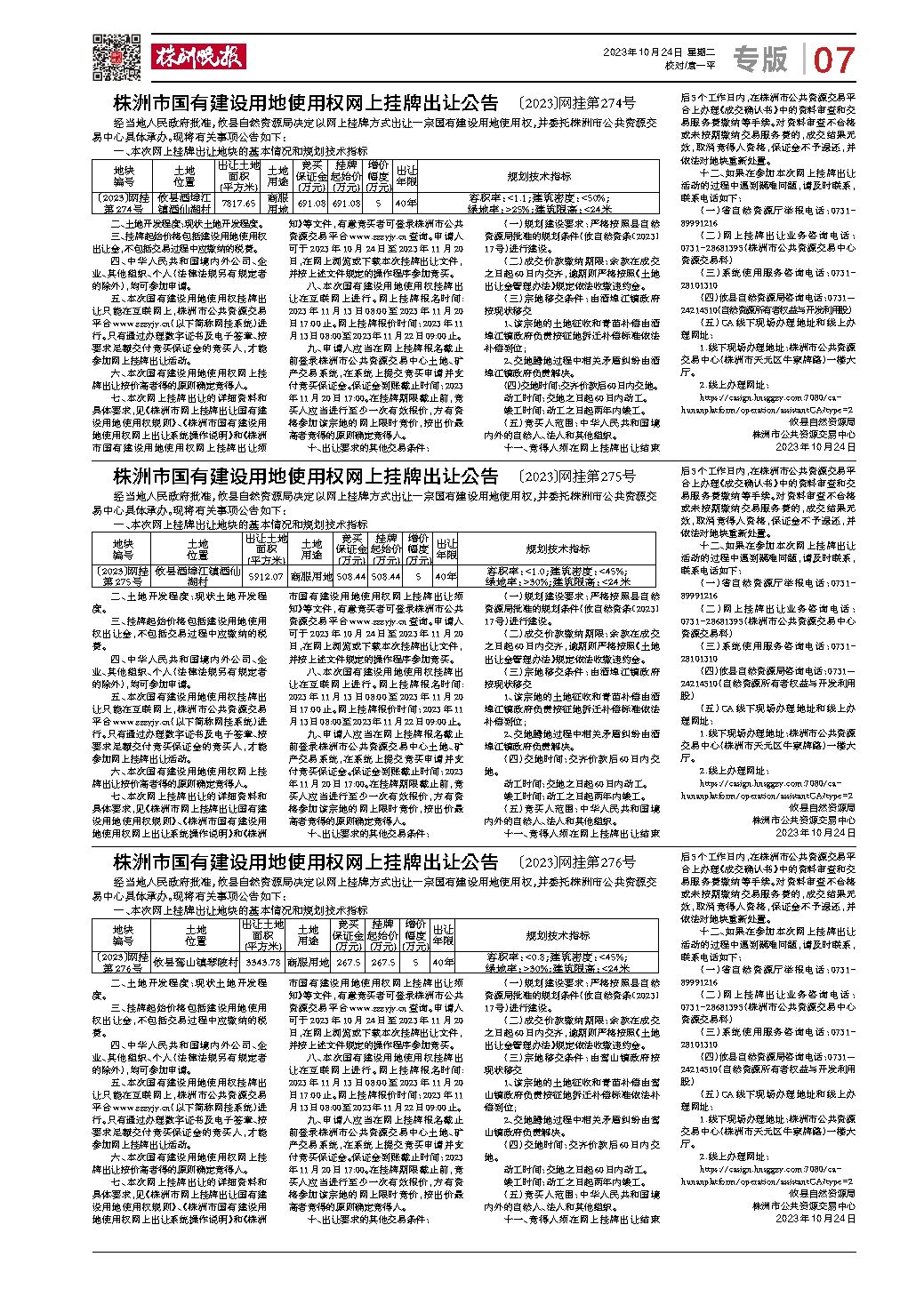 株洲市国有建设用地使用权网上挂牌出让公告 〔2023〕网挂第276号