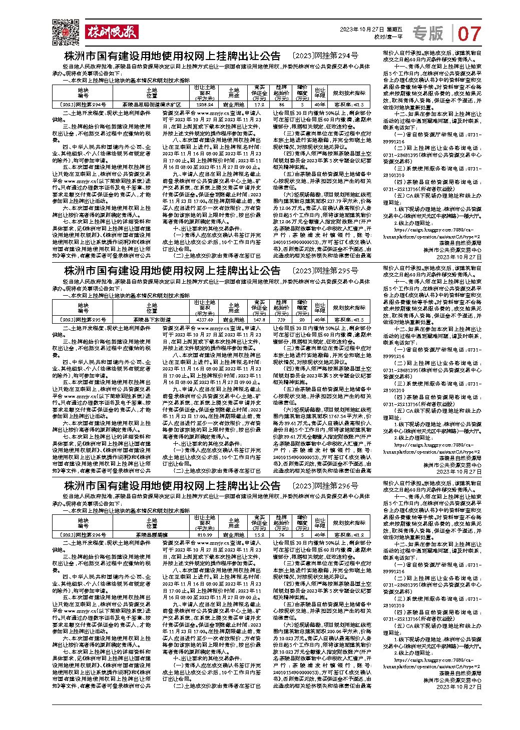 株洲市国有建设用地使用权网上挂牌出让公告 〔2023〕网挂第294号