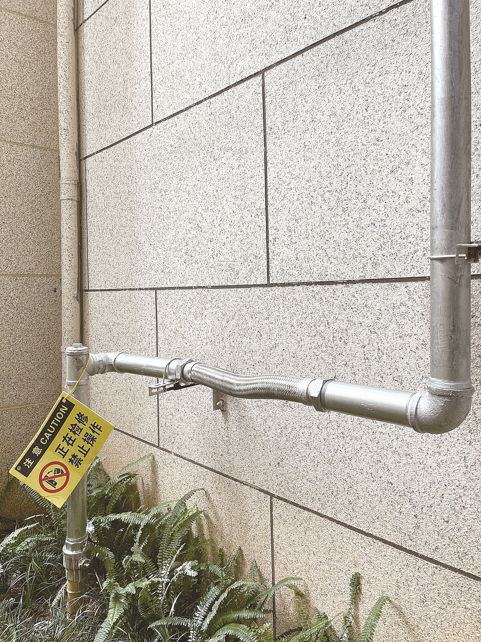 小区燃气管上悬挂检修提示牌。 记者/刘平 摄