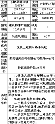位于茶陵县湖口镇妙石村的衡阳—炎陵天然气支线管道工程(4#阀室)一宗供燃气用地的协议出让方案已经茶陵县人民政府批准。从即日起向社会公开发布公告。主要内容如下: