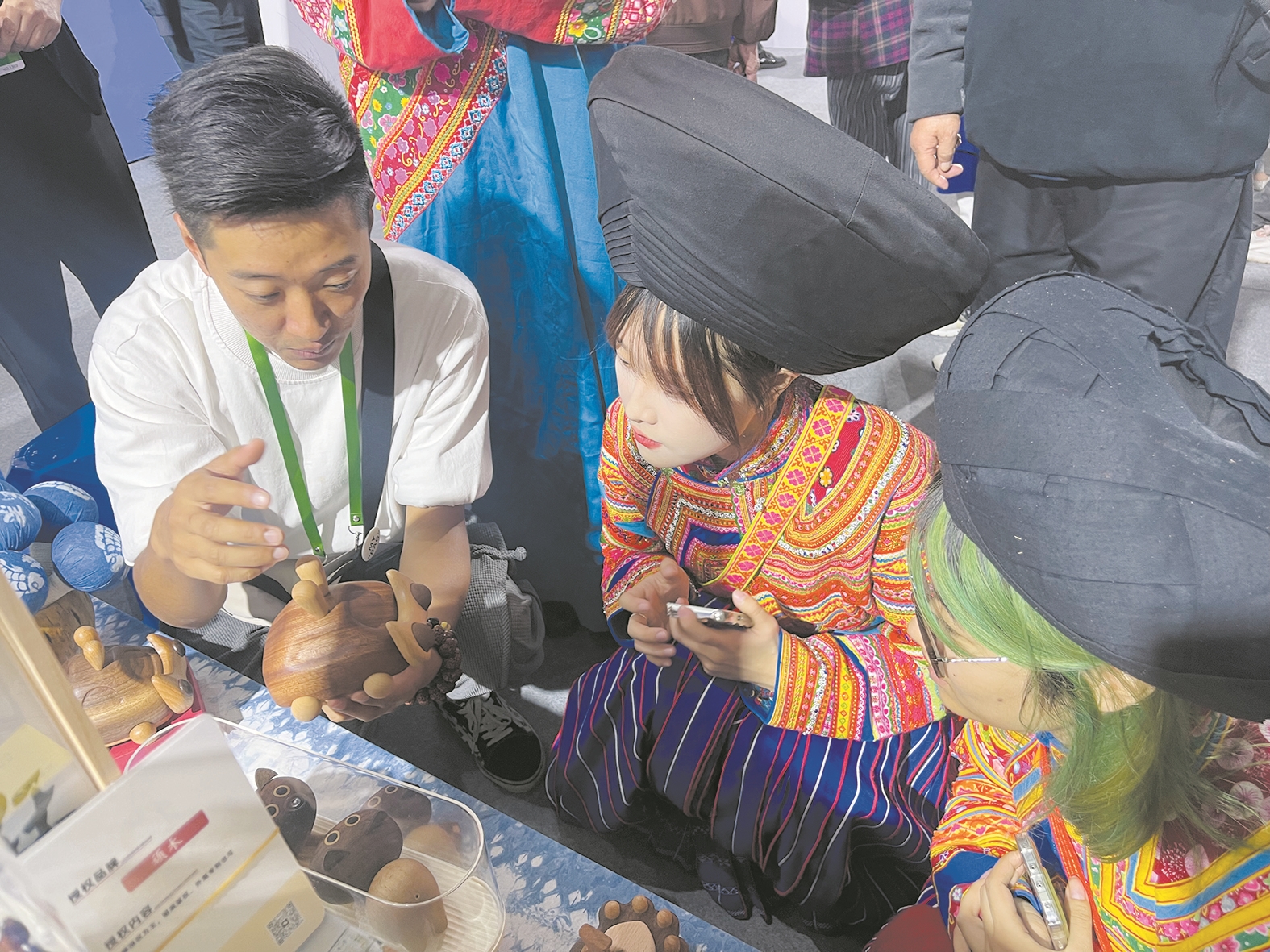 ▶成都非遗节现场,吴氏木雕技艺传承人介绍木制IP作品。受访者供图