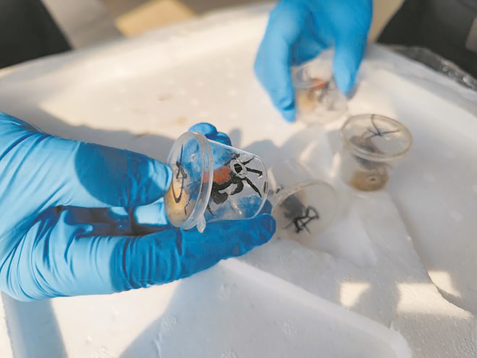 广州海关关员正在查验外来物种“恶魔蟹”。