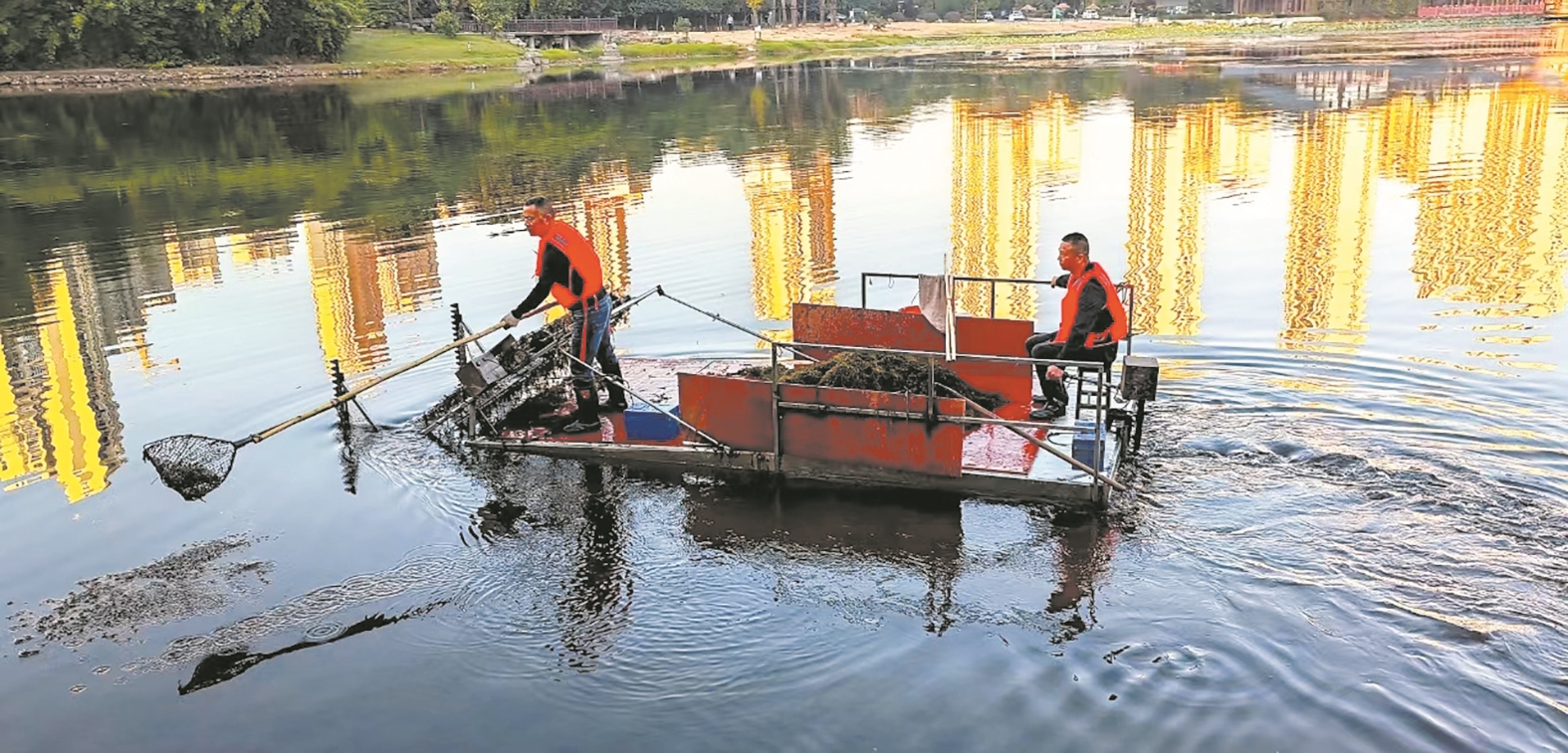 10月17日,秋高气爽,天元区栗雨湖上,工作人员在忙碌地从事水草、漂浮垃圾打捞作业,目的是保护栗雨湖生态环境,希望市民理解并支持劝导工作,身体力行投入栗雨湖水生态环境日常保护工作中。