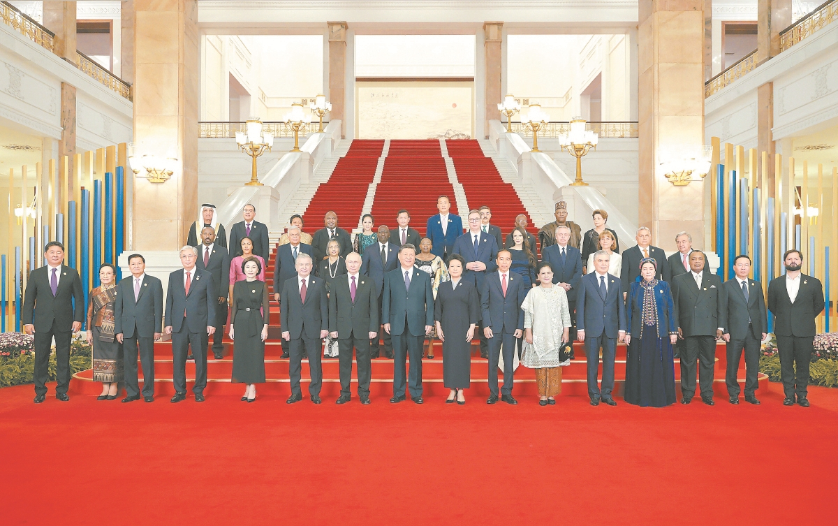 ◀17日晚,国家主席习近平和夫人彭丽媛在北京人民大会堂举行宴会,欢迎来华出席第三届“一带一路”国际合作高峰论坛的国际贵宾。这是习近平和彭丽媛同国际贵宾合影留念。图文据新华社