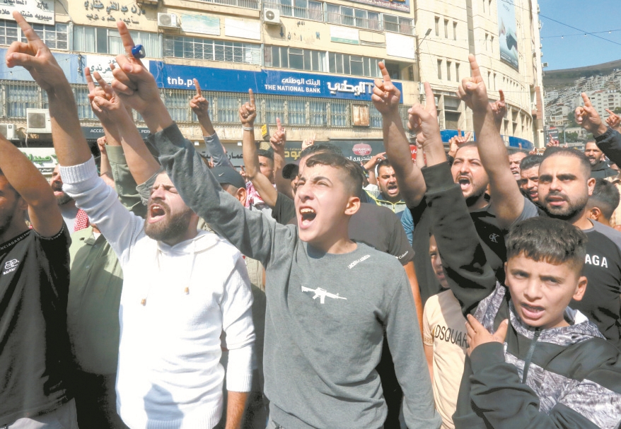 18日,在约旦河西岸城市纳布卢斯,民众抗议加沙医院遭袭。