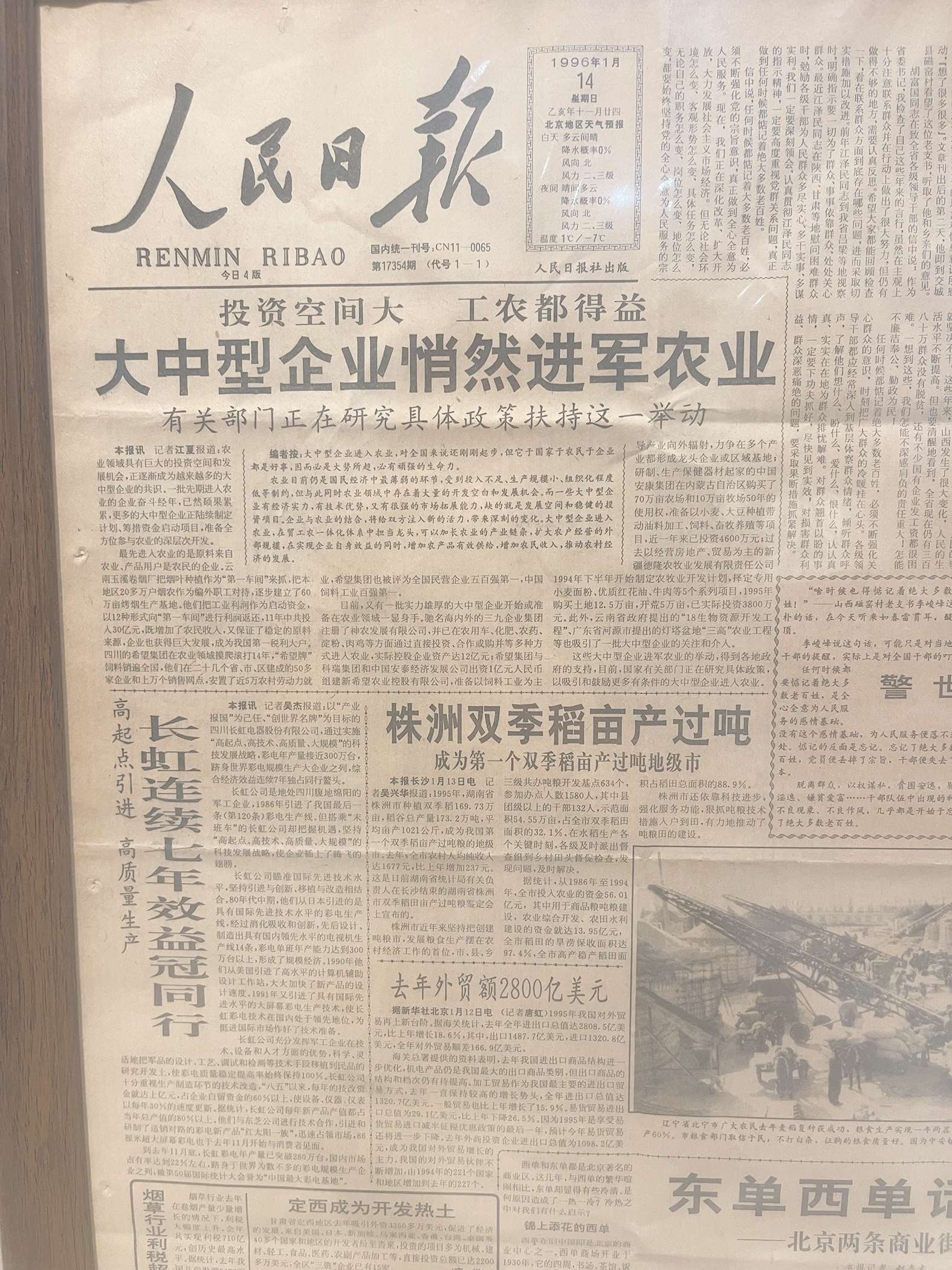 1996年1月14日,《人民日报》头版刊载株洲双季稻亩产过吨的好消息。 记者/伍靖雯 摄