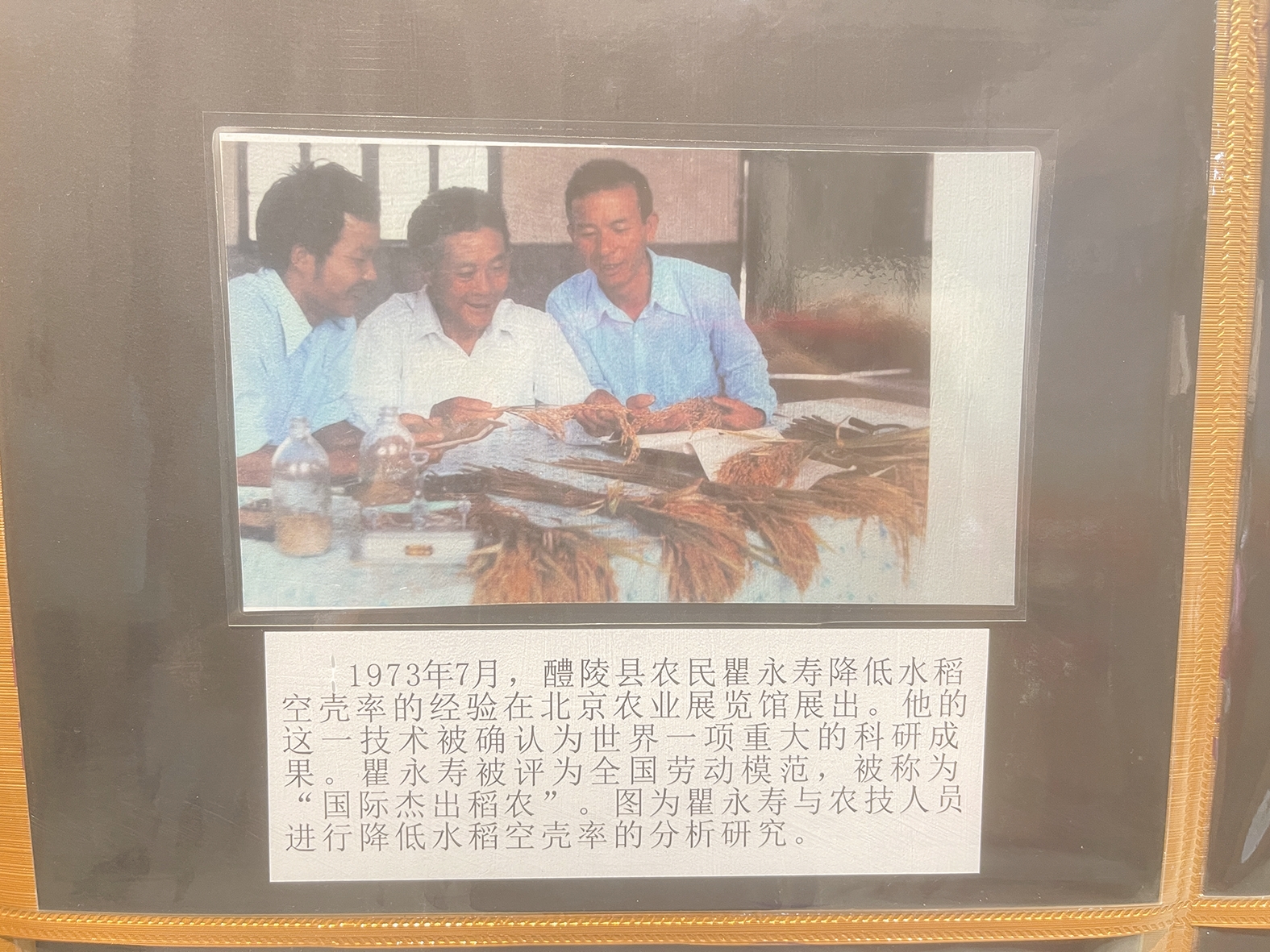 在粮食文化展厅内,一张1996年1月14日《人民日报》格外引人注目。“1995年,湖南省株洲市种植双季稻169.73万亩,稻谷总产量173.2万吨,平均亩产1021公斤,成为我国第一个双季稻亩产过吨粮的地级市。”报纸头版上这条令人振奋的消息,将人们拉回那段艰辛的光辉岁月。