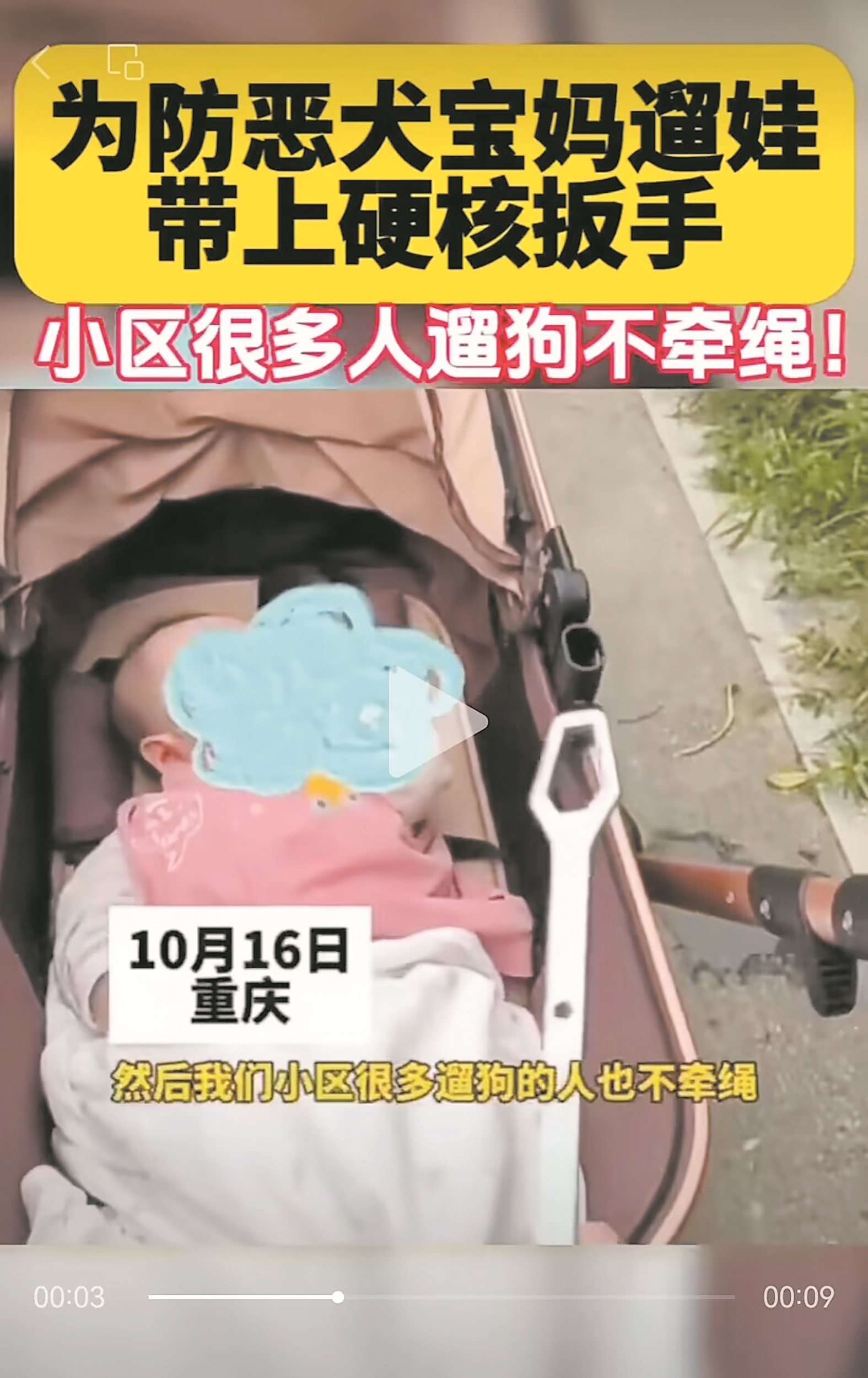 这位宝妈表示,她看到幼童遭恶犬撕咬的视频后很害怕,考虑到自家小区也有很多人养狗不拴绳,所以出门遛娃时特意带上了硬核“武器”——铁扳手防恶犬。