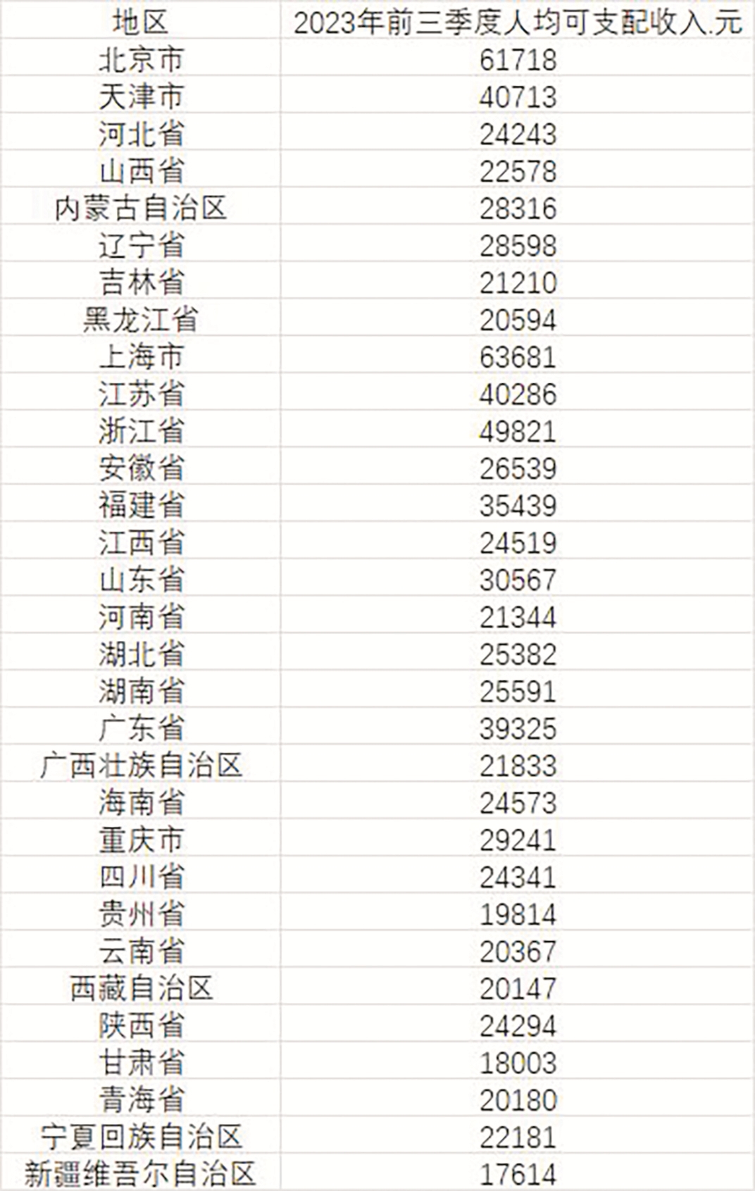 数据显示,有8个省份前三季度人均可支配收入超过3万元,全部来自东部地区,分别是上海、北京、浙江、天津、江苏、广东、福建和山东。其中上海和北京超过6万元。