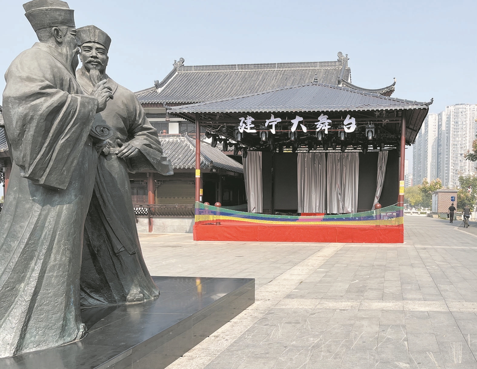 “建宁大舞台”像以前的老戏台,长宽各有8米,高有4.5米,舞台内安装有不少舞台灯具,舞台外观与分袂亭景点建筑的风格一致。市民间文艺家协会相关负责人介绍,“建宁大舞台”于10月中旬完成搭建,已在10月21日举办过一次社区邻里节活动。接下来,“建宁大舞台”将会开展文艺汇演等活动,丰富人民群众精神文化生活,助力建宁文化市集打造成夜间经济新名片。