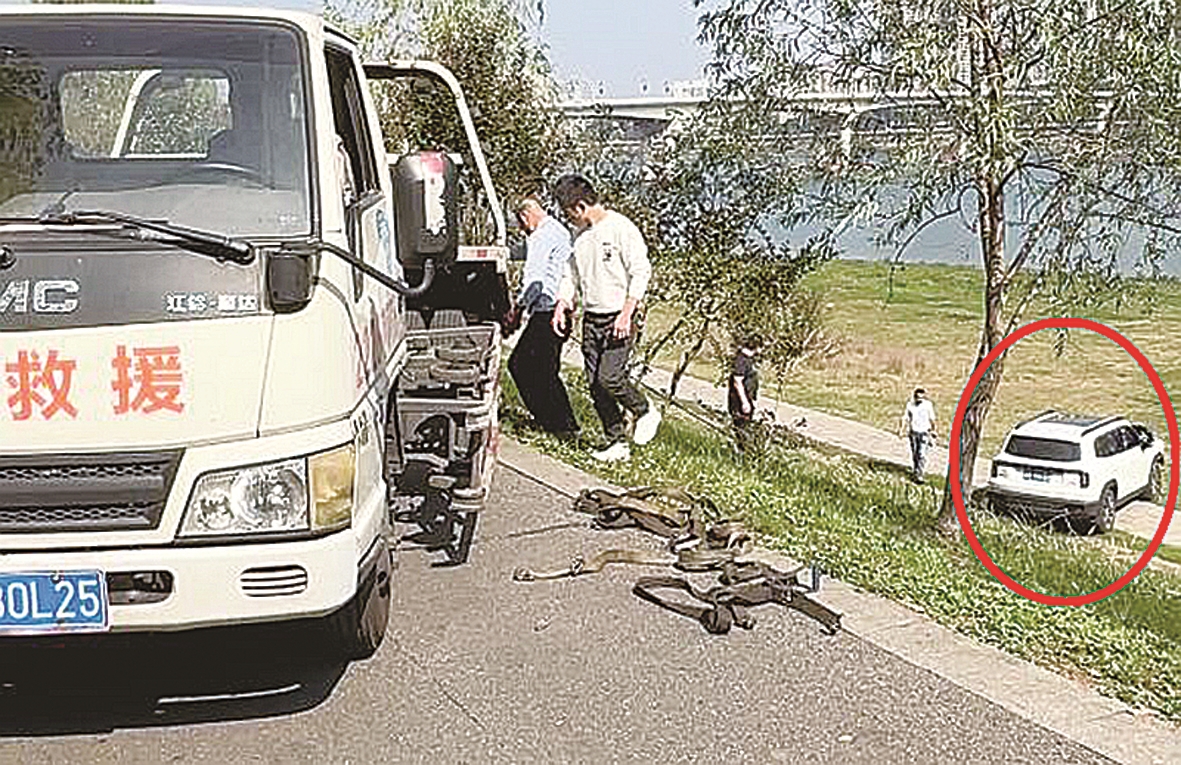 11月2日上午,专业人员对一辆意外冲入湘江风光带的事故车辆进行拖移。