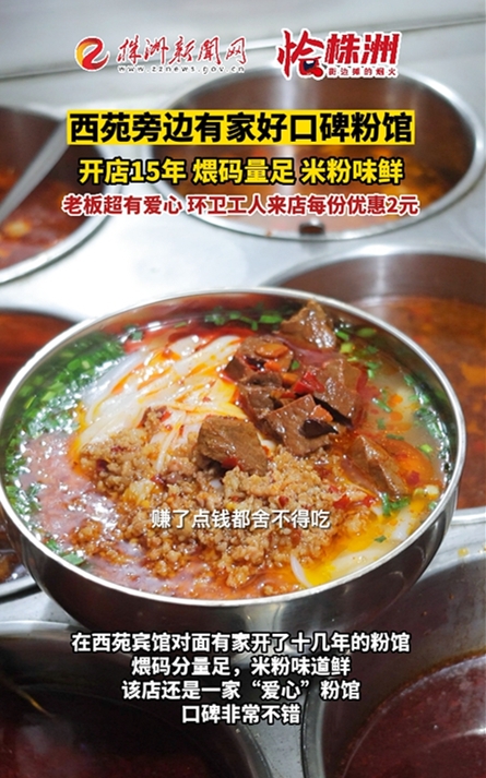 天元区西苑宾馆对面有家开了十几年的粉馆,煨码量足,米粉味鲜,口碑非常不错。老板超有爱心,环卫工人来店每份优惠2元。