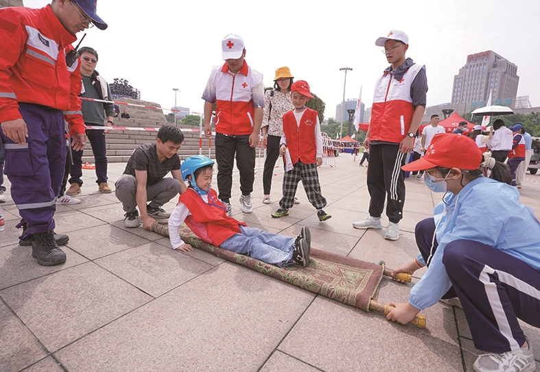普及应急救护知识红十字嘉年华活动 应急救护之亲子越野闯关活动中,校园记者和父母协力合作完成通关任务。