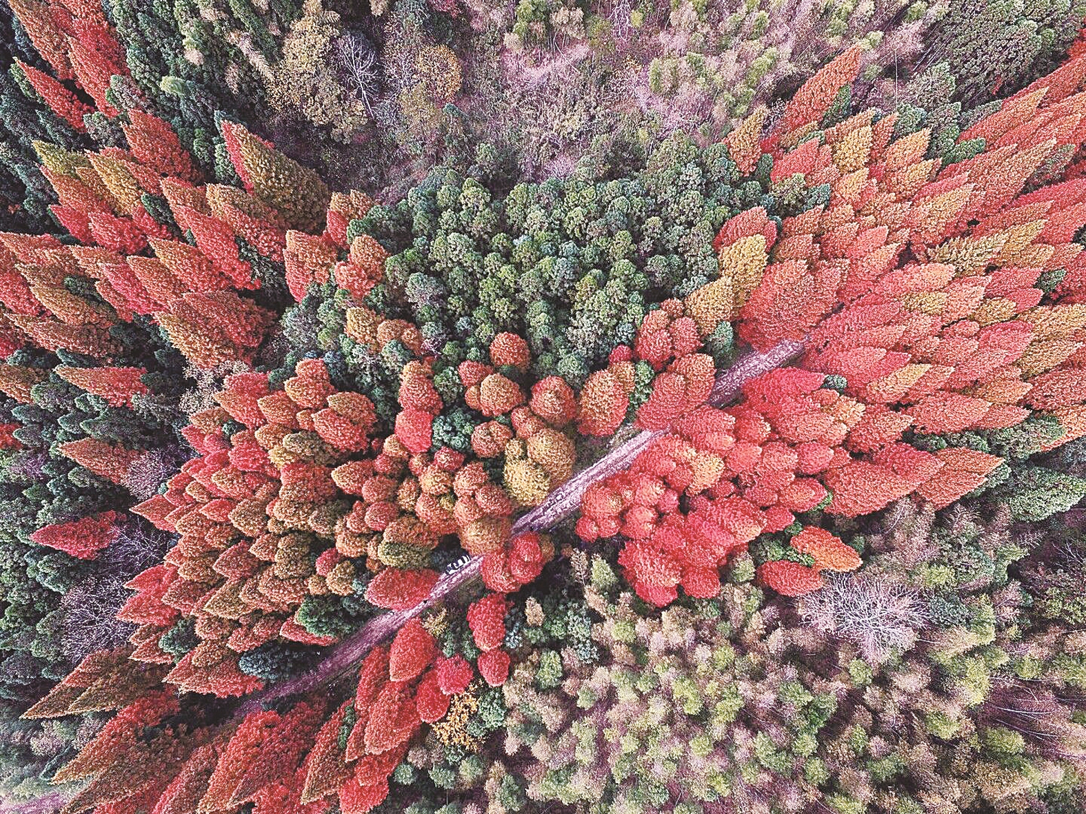 立冬时节,炎陵县神农谷森林公园礁石水杉林景点,满山的红橙黄绿各色林木竞相斗艳。