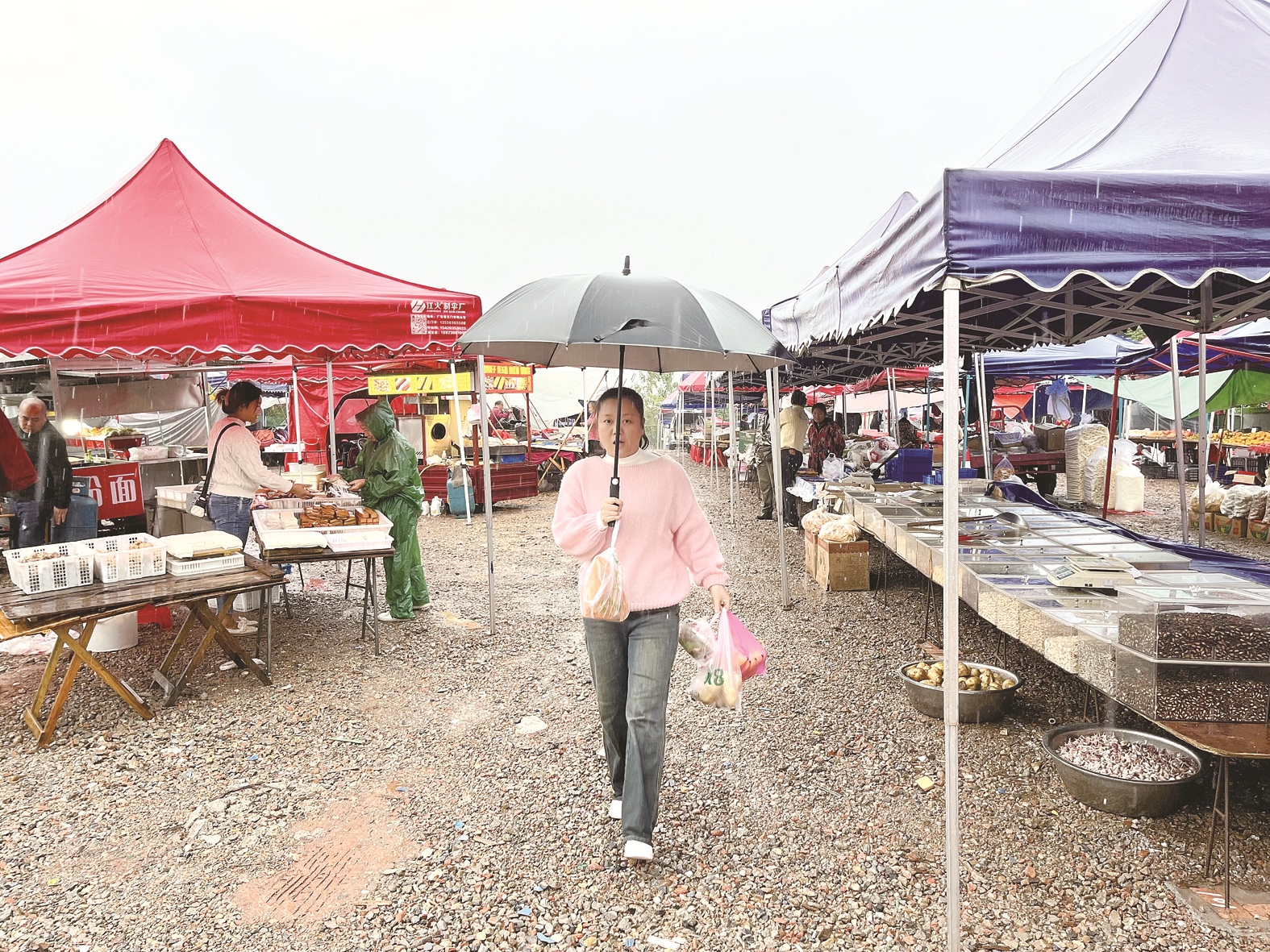 本报讯(株洲晚报融媒体记者/刘平) “皂角(荚)树那里又可以赶集了!”11月9日,虽然下着大雨,但位于天元区清水塘大桥桥头附近的嵩山路街道隆兴社区五队,设在路边空地上的隆兴集市依然按期开张,吸引不少摊主摆摊、不少市民撑着雨伞赶集。