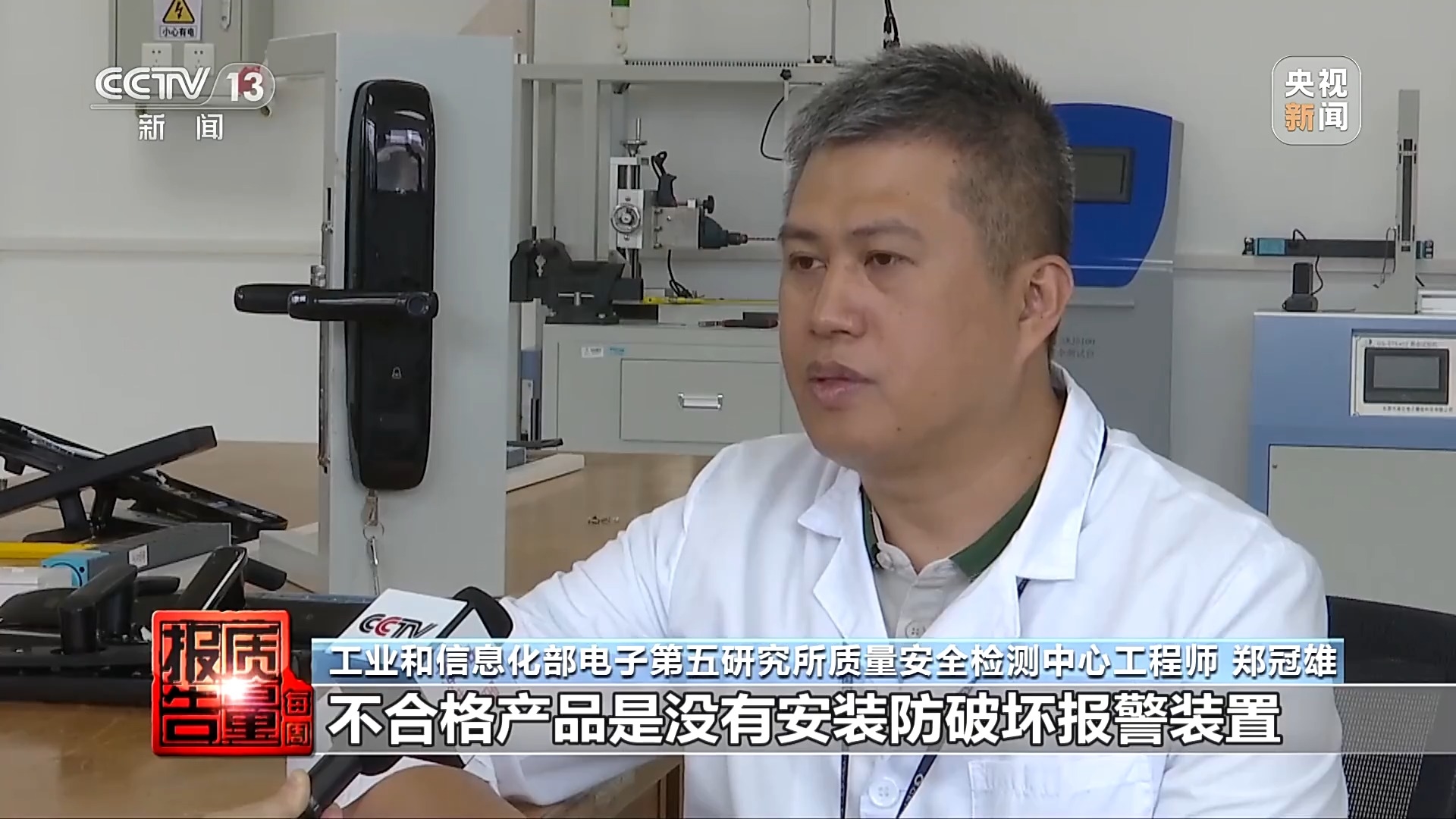 工业和信息化部电子第五研究所质量安全检测中心工程师郑冠雄:不合格产品是没有安装防破坏报警装置,这种情况下如果门锁在遭到破坏时就没有起到相应报警作用。有一些企业为了节约成本,把防破坏报警装置给去掉了,导致了产品不合格。