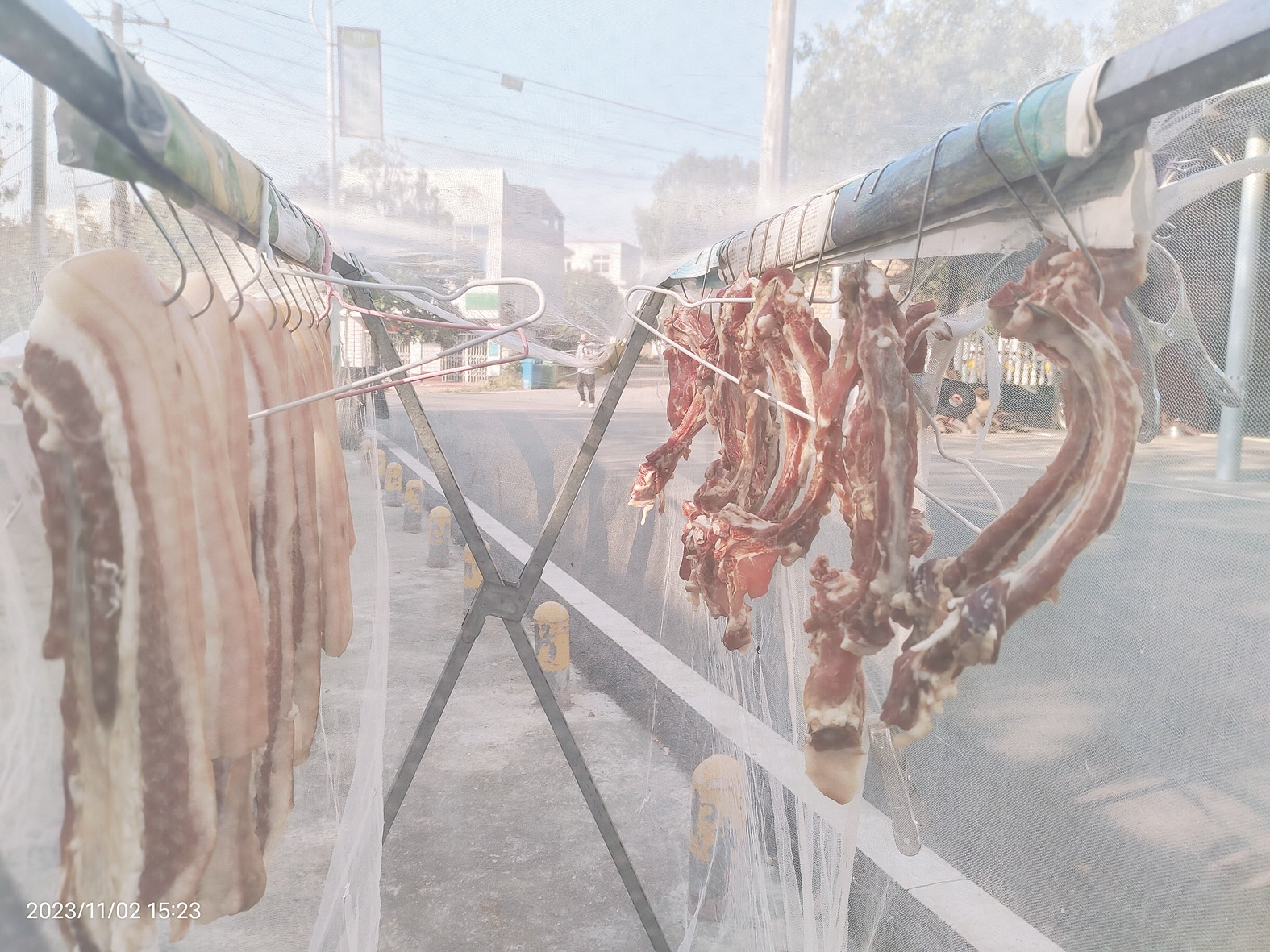 不锈钢落地式晾衣架上,左边一排肥瘦相间的五花肉,右边一排肌肉饱满的排骨。浅浅的酱色告诉人们,它已经历了一轮腌制入味。同行的另一位记者颇为感叹:有闲情有闲情。我看到的是即将美味的腊肉,他为何看到的是闲情?经他提示,才看到包裹在外边的蚊帐。