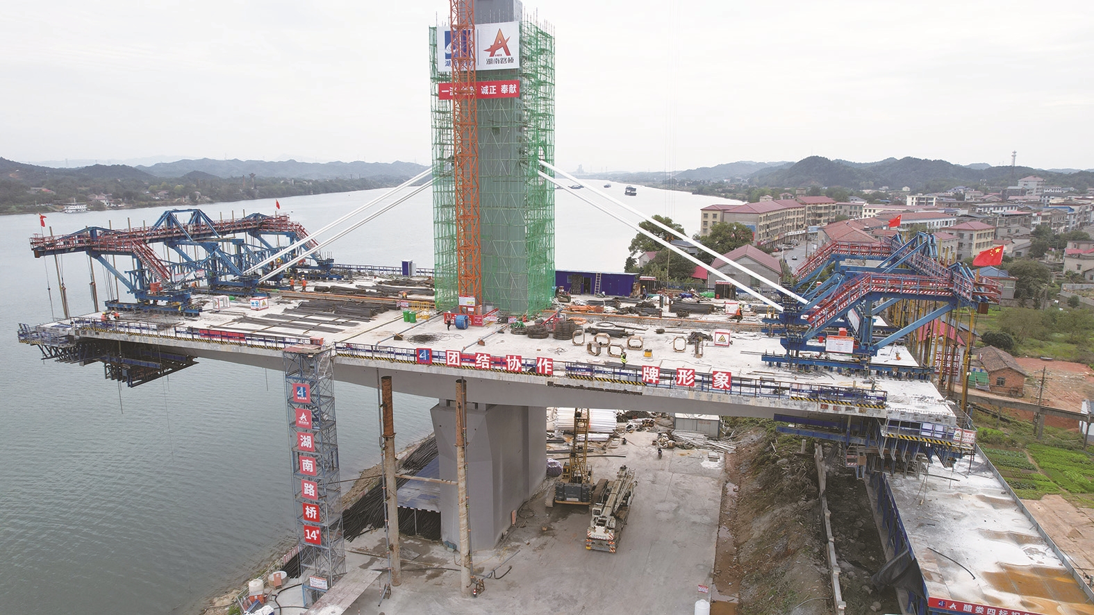 目前,两个边跨已经进入了有索区的施工阶段,到下个月,两个中间的主墩也将进入有索区的全面施工。