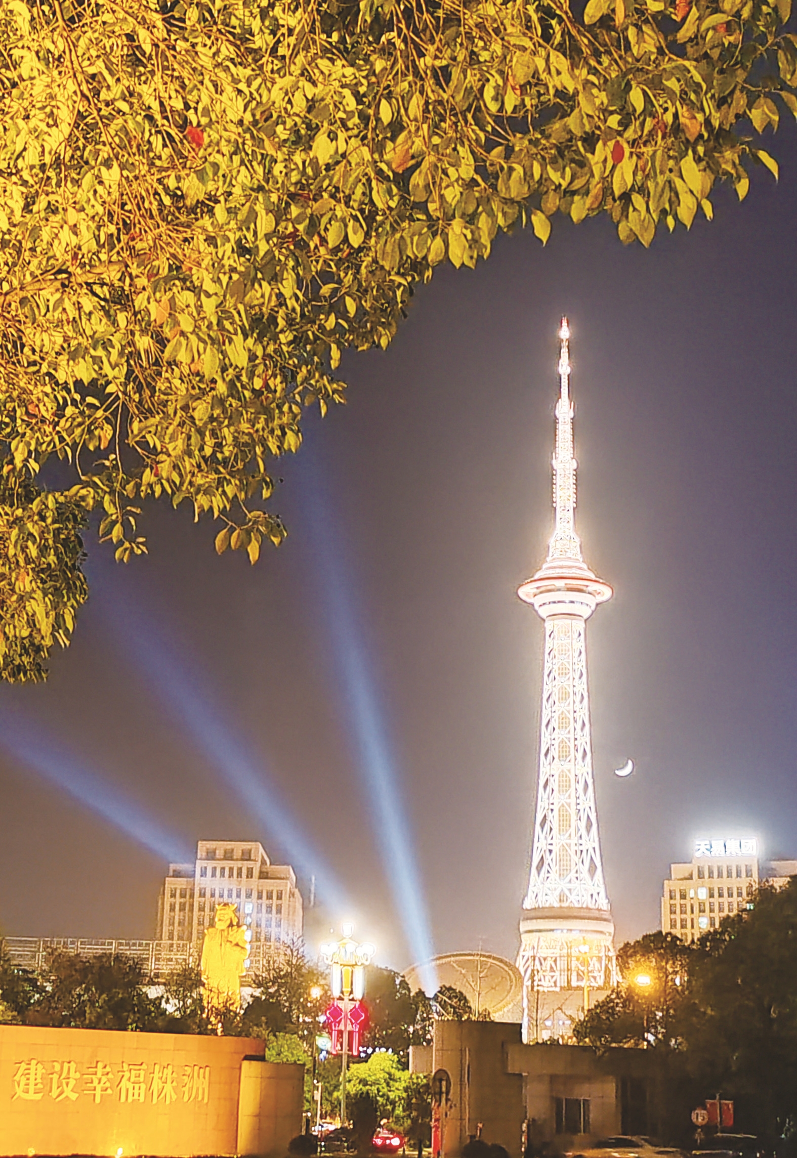 11月19日晚,天元区神农广场,神农塔和月牙相映生辉。记者/刘震 摄