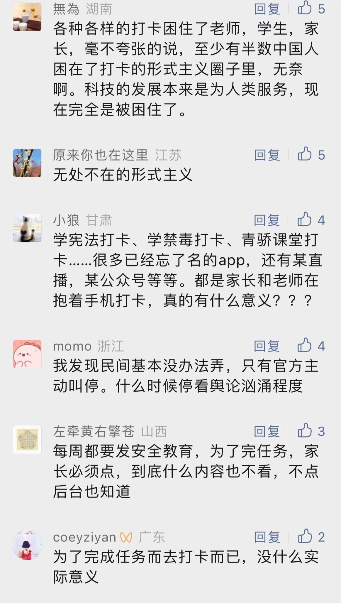 “希望跟进,这是给学生和家长减负,也是给老师减负。”“安全教育平台上的内容是孩子不看家长看,任务大多沦为家长的负担,确实应该改变了。”“一有打卡老师就发到家长群,你说家长不做谁做?毫无意义的形式主义。”“有的内容确实很好,但是考核形式不好,建议自愿观看,不作强制要求。”