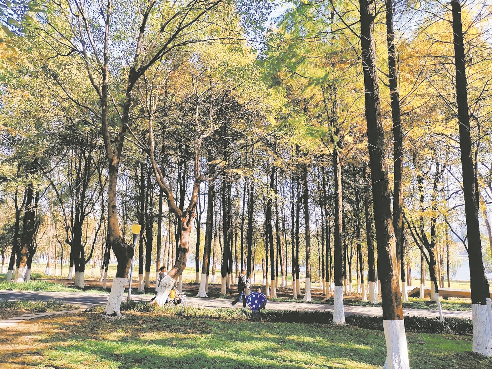 11月21日上午,天元大桥附近的河西湘江风光带,趁着阳光明媚,市民在树林里遛娃。通讯员/张顺湘 摄