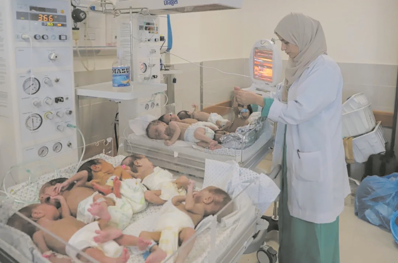 11月19日,在加沙地带拉法的一家医院,医护人员照顾从希法医院撤离的早产儿。