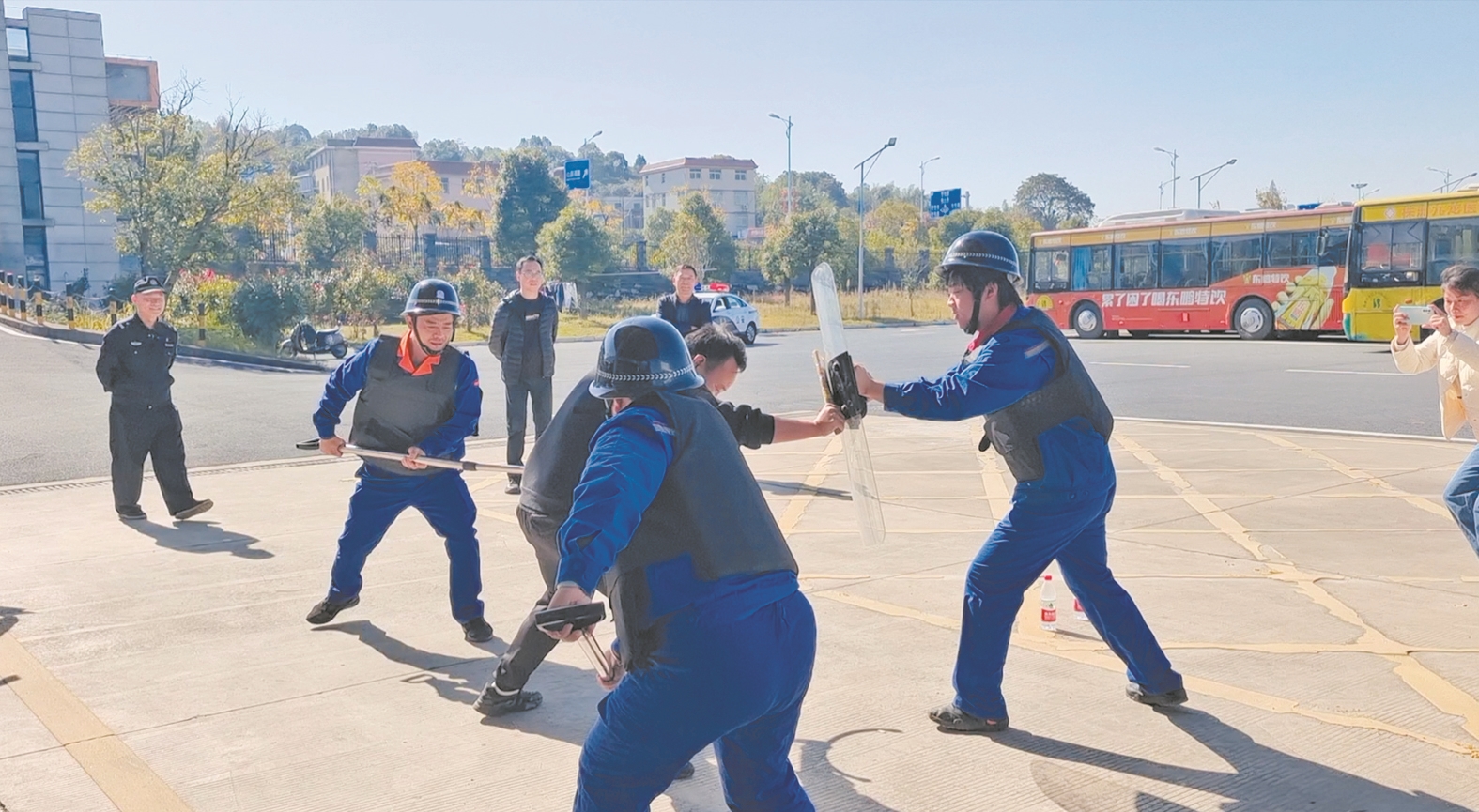 11月21日,一名“歹徒”与加油站工作人员发生冲突,持刀欲砍杀工作人员。加油站立即启动应急响应,第一时间报警的同时,工作人员穿戴好防护装备,齐心协力将“歹徒”制服。——这是公交物资公司在金山公交基地开展技术大比武暨反恐防暴演练。