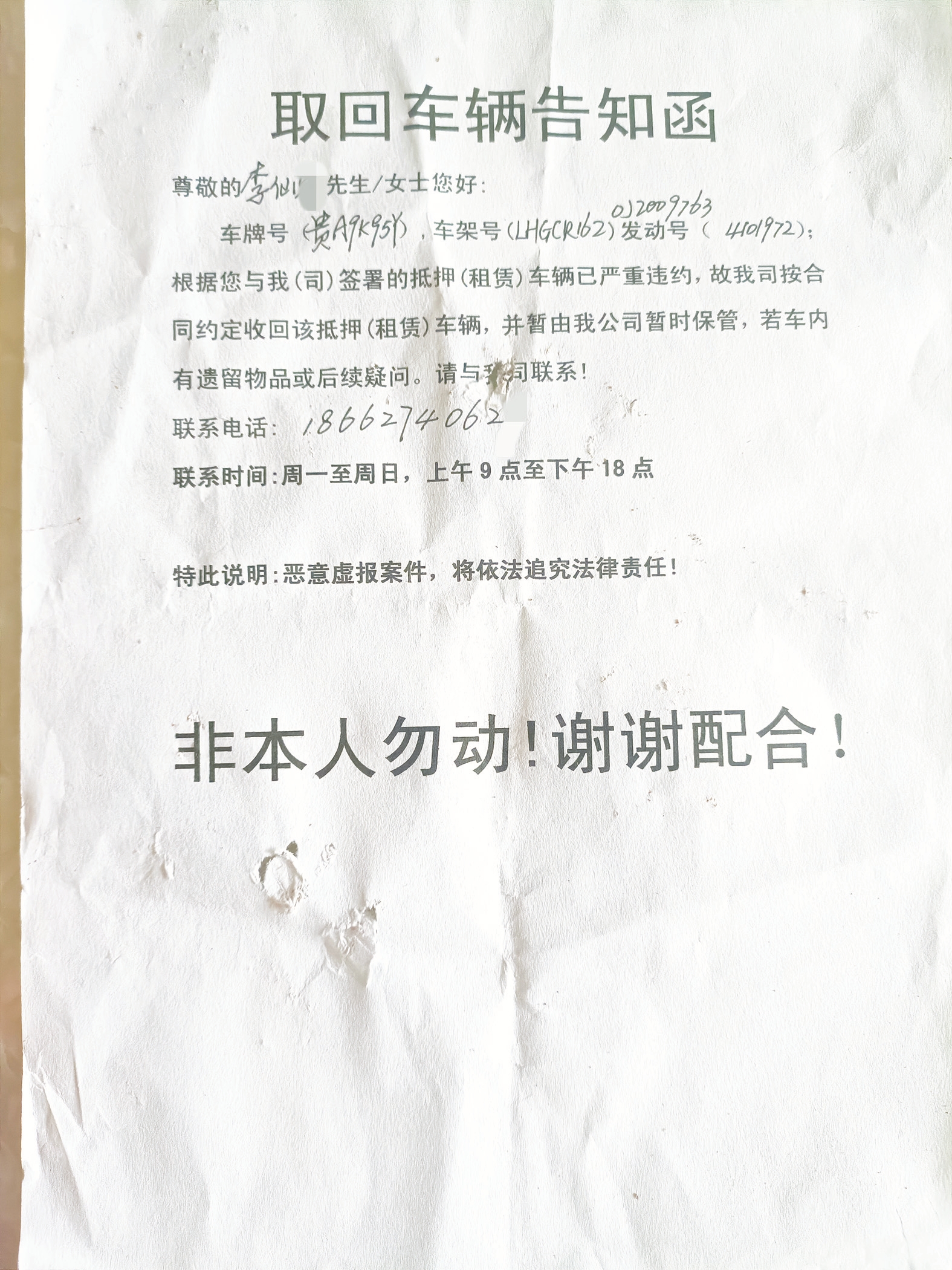 ▲拖车公司留在原地的《取回车辆告知函》。(受访者/提供)