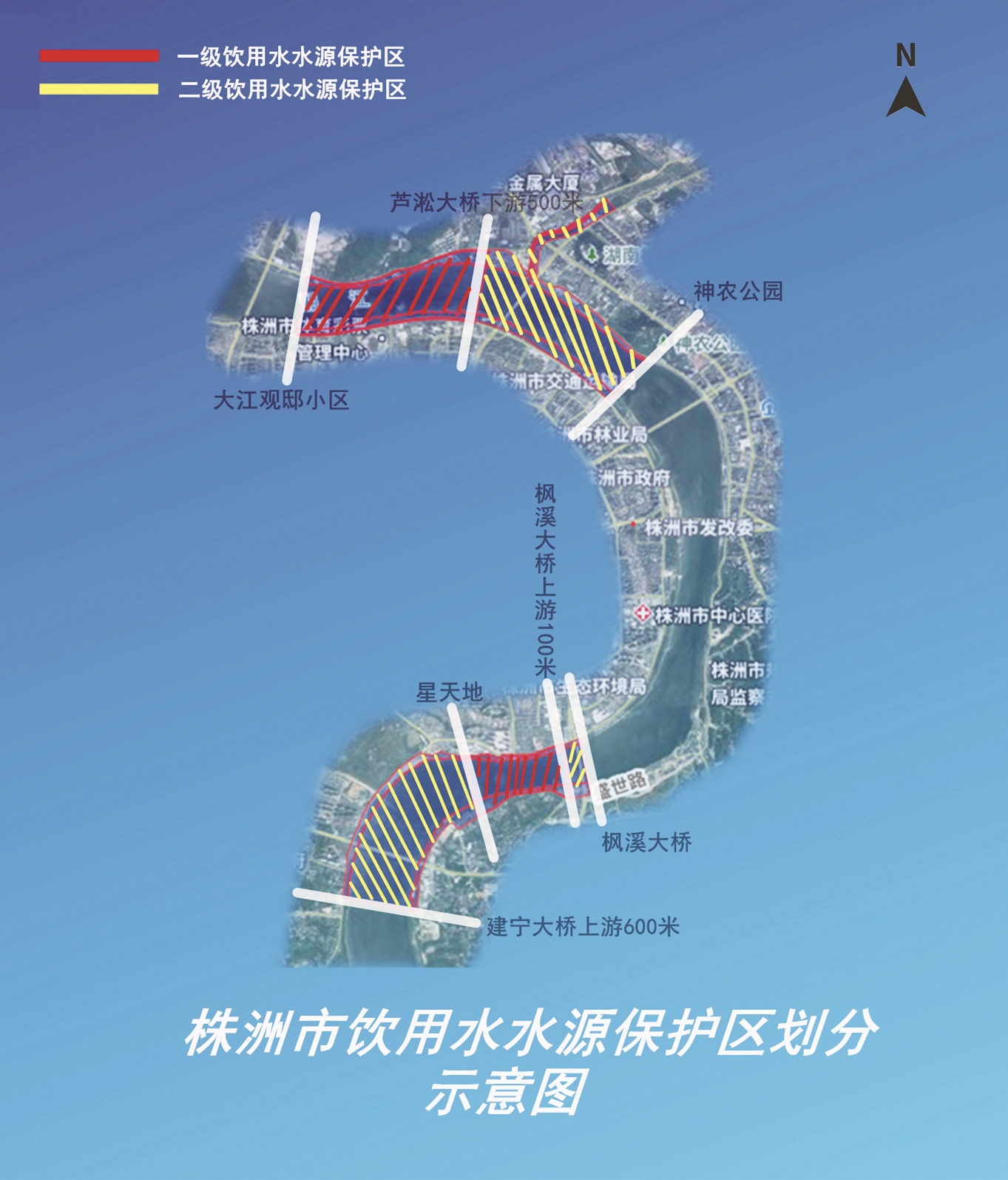 目前,湘江株洲城区段的饮用水水源保护区为二、三水厂保护区和四水厂保护区。二、三水厂饮用水水源保护区范围为神农公园至大江观邸小区段,其中芦淞大桥下游600米至大江观邸小区段,为一级保护区;四水厂饮用水水源保护区范围为建宁大桥上游600米至枫溪大桥段,其中星天地至枫溪大桥上游100米段,为一级保护区。