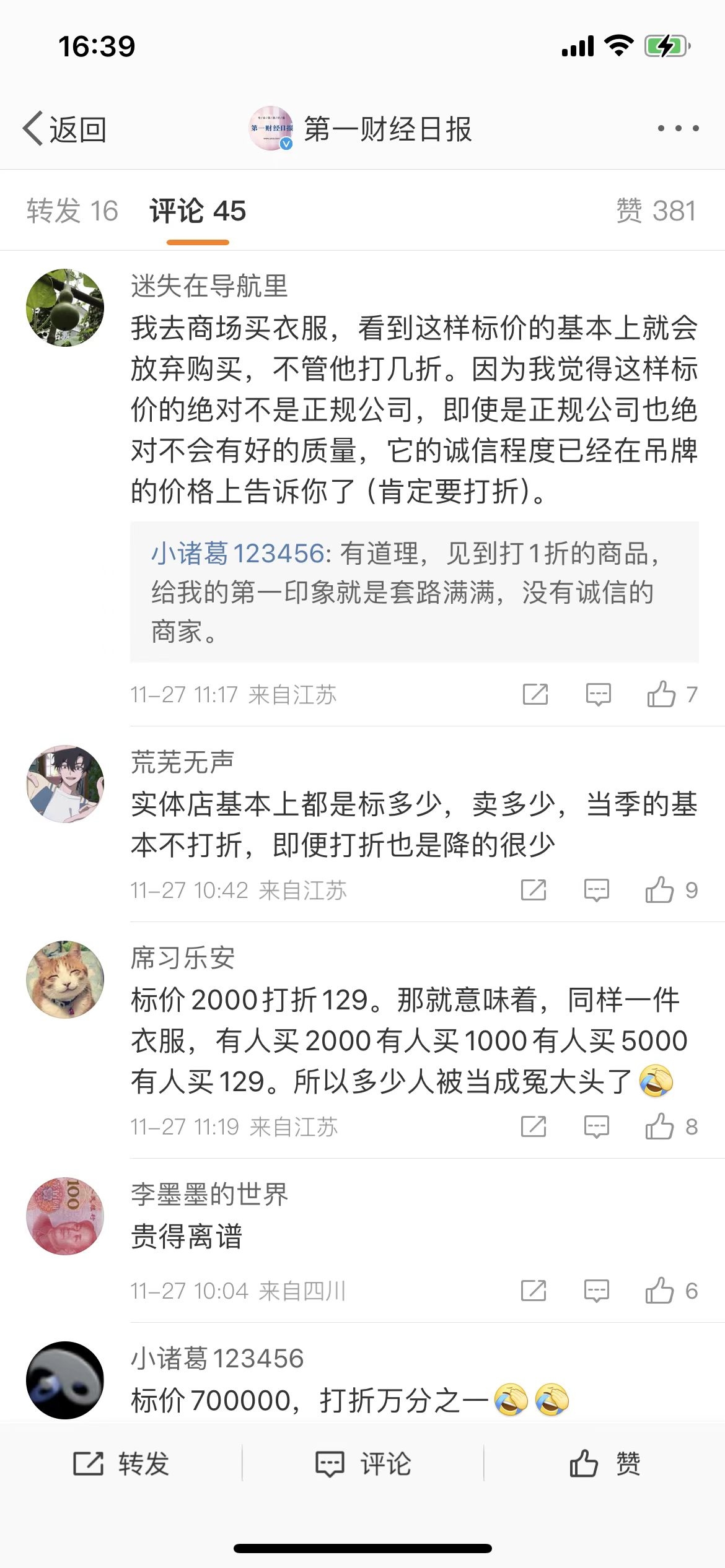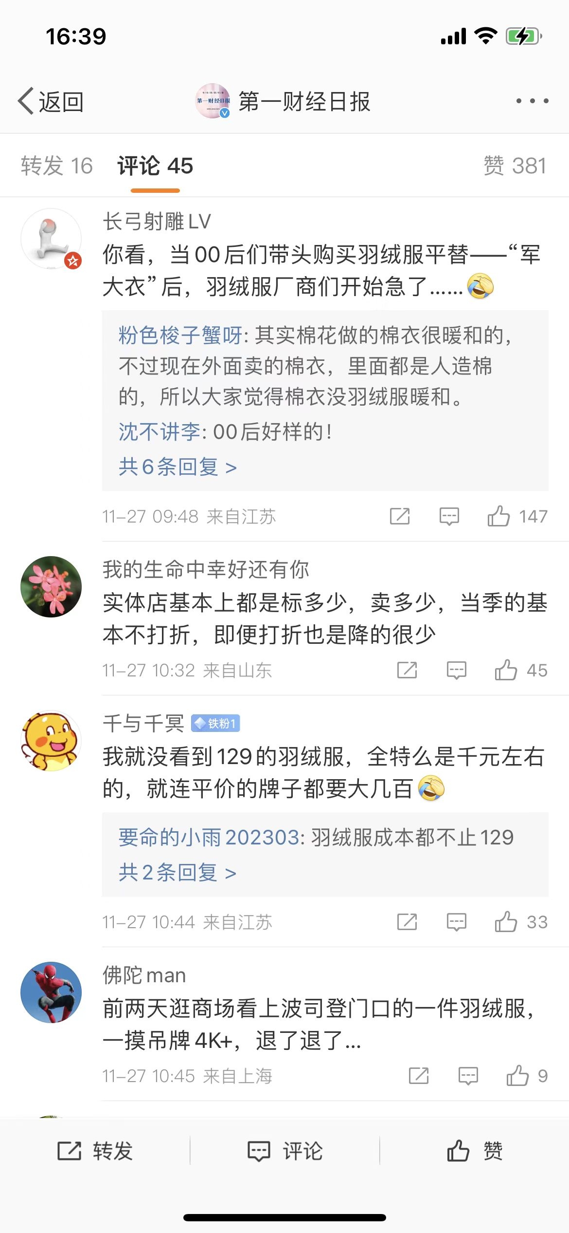 “国产羽绒服卖到7000元”“你能接受千元以上的国产羽绒服吗”话题也冲上了微博热搜。翻看微博话题下的评论,记者发现人们争论的主要焦点有两点:千元国产羽绒服到底贵不贵?这个冬天有没有必要买一件上千元的羽绒服?