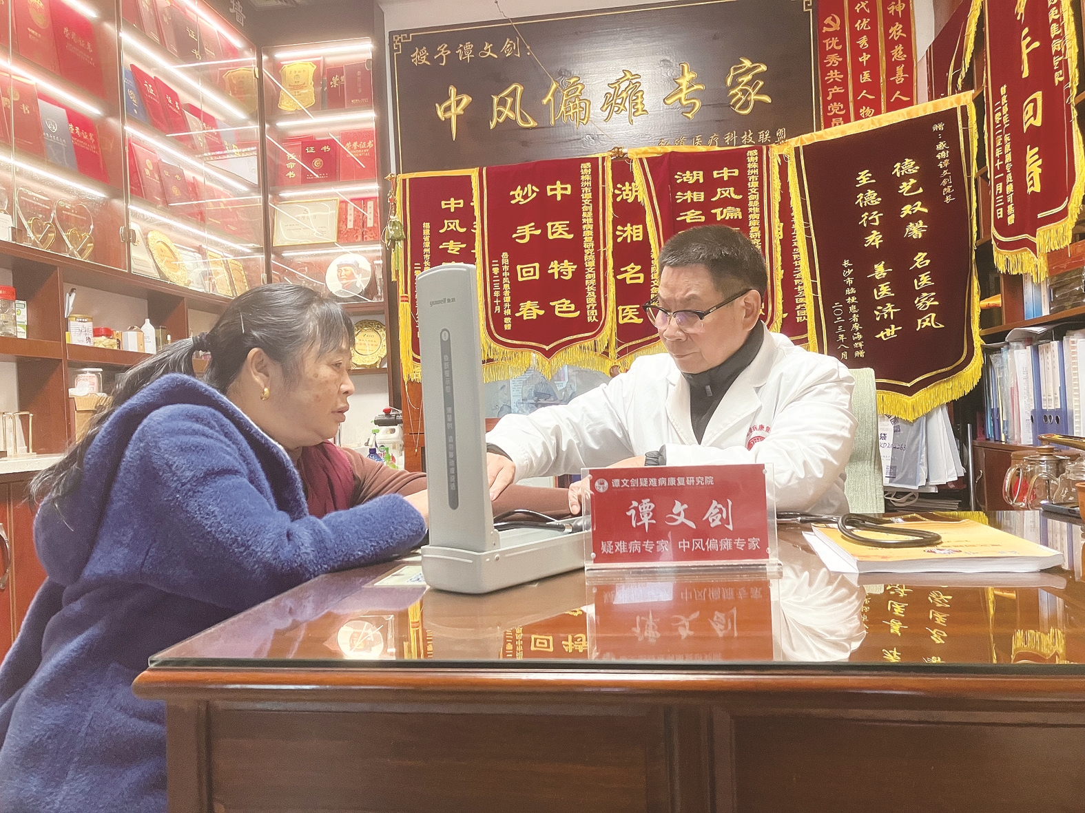 从医36年来,他接诊了几千例中风偏瘫患者,经过治疗后,绝大多数病人能重新生活自理,还有一部分病人重新回归工作岗位。谭文剑门诊部的过道和诊室里挂满了全国各地患者送来的锦旗,谭文剑也因此被称为“锦旗医生”。