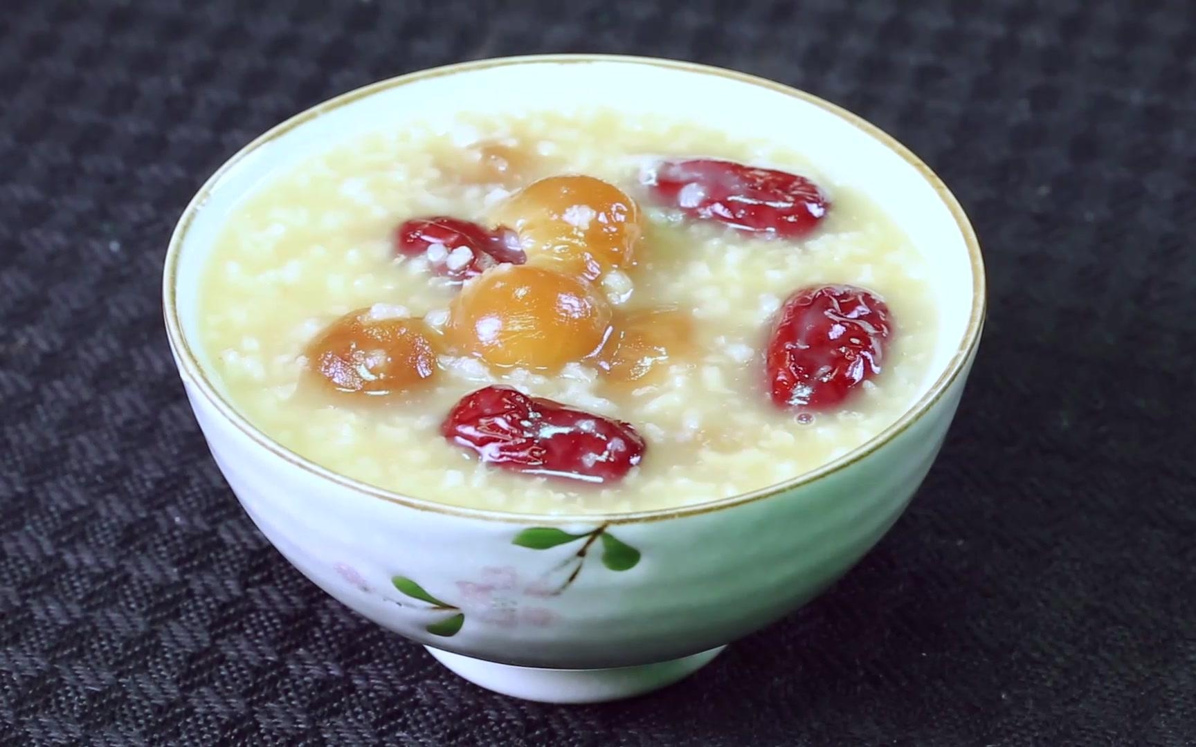 做法:将粳米和龙眼肉、红枣放入清水中,大火煮沸后再用文火熬30分钟,至米熟烂即可,加适量白糖,每日早晚各热服1次,不宜过量。