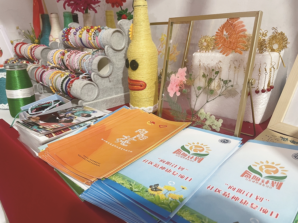 走进会议室,这里挂满了黄字红底的锦旗,摆放着精神障碍患者、志愿者共做的各类手工作品。两束向日葵靠窗摆放,向阳而生。